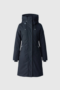 SHILOH-NFZ is a 2-in-1 recycled down for women three-quarter with removable lustrous down bib and adjustable storm visor hood. Our proprietary Nordic Tech weave delivers ultimate comfort in the coldest weather. The leather welt storm placket add custom warmth. Skillfully tailored for fashion-forward versatility. DETAILS - Three-quarter length down coat - Removable lustrous light down bib - Recycled down - 800 fill power - Traceable duck down - Arctic rated: Down to -25°C - Nordic Tech weave for ultimate warmth - Hood with adjustable storm visor - Center front zip with storm placket - Hidden snaps with leather welt - Insulated zip waist pockets - Storm cuffs - Signature M logo on left sleeve - Fitted silhouette SIZE & FIT - SEMI-FITTED – Follows your body’s shape with ease. - Designed to be worn with light layers. - Coat length from shoulder to hem: 37.5'' / 95.25 cm. COMPOSITION & CARE - Shell : 59% polyamide/nylon, 41% polyester. Combo 100% cow leather. Lining : 100% polyamide/nylon. Filling: 90% duck down, 10% feathers. Water-repellent & water-resistant. - Dry clean by leather specialist using oil based solvent only. Do not use perchloroethylene.