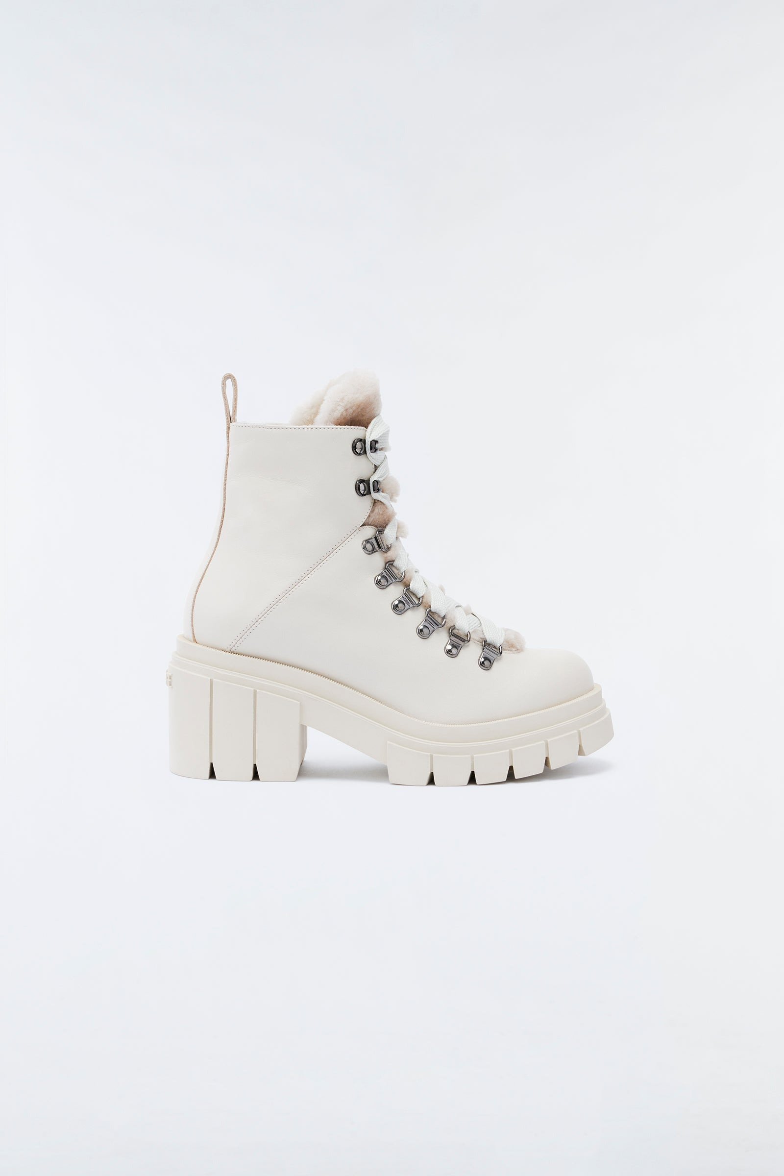 SUMMIT is a water resistant and repellent mid-heel lace-up leather ankle boot for women with shearling lining for extra warmth. An on-trend built-up rubber sole adds traction and edge. An elegant all-weather boot. DETAILS - Lace-up lamb leather ankle boot - Deep Cold: Down to -20°C - Shearling-lined - Mid-heel - logo on back heel - Built-up rubber sole - Loop tab on back shaft - Hook and loop lace up system - M logomark outline embroidery COMPOSITION & CARE - Shell: 100% cow leather. Sole: 100% rubber. Lining: 100% sheep. Water-resistant. - Wash gently by hand