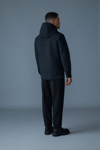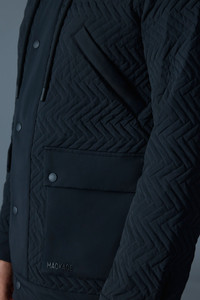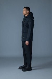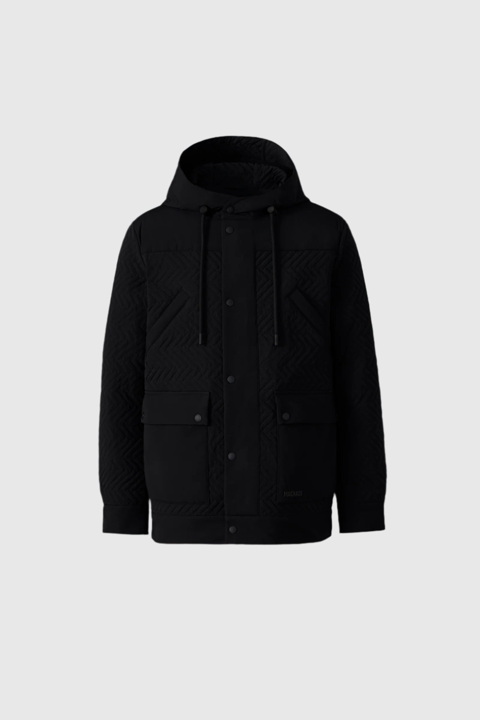 THIAGO is a regular fit, down-filled jacket crafted from sustainable materials with a chevron-quilted design. Ideal for temperatures down to -5ºC, it features GRS-certified recycled down for warmth without bulk. Functional and stylish, this jacket includes an adjustable hood, multiple pockets, and MACKAGE branding, making it a versatile outer layer. DETAILS - Down-filled quilted jacket - Chevron-quilted body with down fill - Adjustable hood opening with bungee cord and stopper - Center front closure with zipper, placket, and snaps - Adjustable sleeve cuffs with snap - Welt pockets with zipper opening - Double-entry patch pocket at waist with flap and snap - MACKAGE silicone branding at pocket - Unlined - Machine washable - Temperature rating: -5°C SIZE & FIT - REGULAR – Classic fit allowing comfort and style. - Designed to be worn with heavier layers. - The model is 6'2" (187 cm) and wears a size 40. - Coat length from shoulder to hem: 29 ¼'' / 74 cm. COMPOSITION & CARE - Shell: 82% recycled nylon, 18% elastane/spandex. Combo shell 1: 82% recycled nylon, 18% elastane/spandex. Filling: 90% GRS-certified down, 10% feathers. Water repellant. - Close zippers. Remove fur. Remove all removable trims. Wash inside out. Wash in domestic machine in water not exceeding 40°C, at normal setting. Use mild detergent. Remove immediately after washing. Do not soak. Tumble dry low heat with tennis balls, until fully dried (1 to 3 hours). Do not wet-clean. Do not bleach. Do not wring. Do not iron or press. Dry clean using oil-based solvent only. Do not use perchloroethylene.