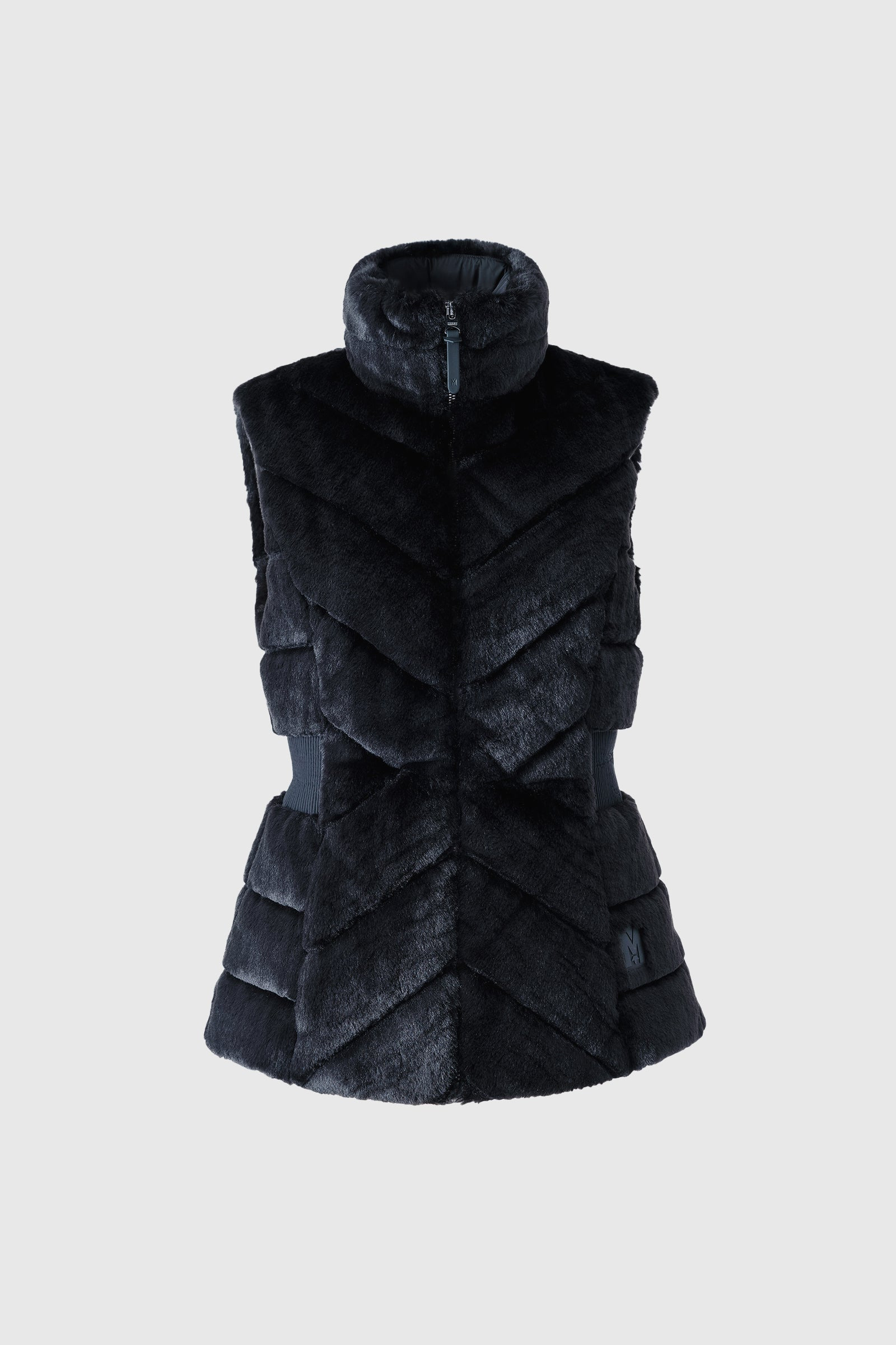 TWIGGY is a lightweight down vest designed with a faux fur shell. Smocked elastic panels and subtle piping details add texture and ease, while hidden zip pockets offer streamlined storage. Perfect for layering through transitional weather. DETAILS - Lightweight quilted down vest - Faux fur shell - Temperature Rating: +5°C - GRS-certified recycled down - Quilted body - 2-way center front zipper closure - Smocked elasticized detail at sides - Inner welt pocket with zipper - Pocket with hidden zipper - Piping detail - Faux fur - Stand collar - Inside front storm placket - Silicone M logo patch - Regular fit SIZE & FIT - SEMI-FITTED – Follows your body’s shape with ease. - Designed to be worn with light layers. - The model is 5'11" (180 cm) and wears a size S. - Coat length from shoulder to hem: 26'' / 66 cm. COMPOSITION & CARE - Shell: 100% polyester. Lining: 100% recycled nylon. Filling: 90% recycled down, 10% recycled feathers. - Dry clean by leather specialist using oil based solvent only. Do not use perchloroethylene.