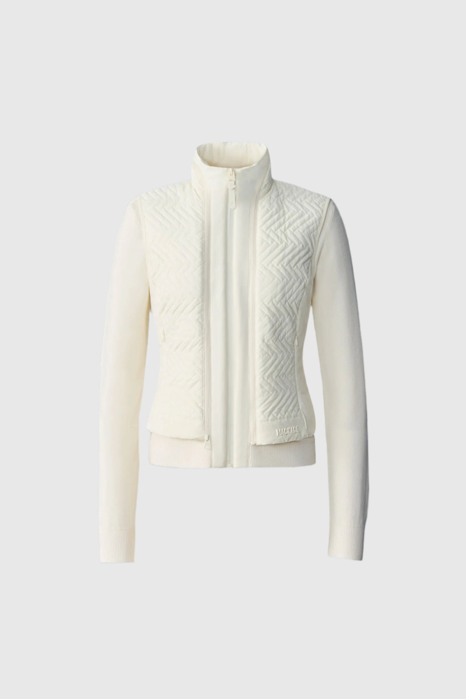 VIVEKA is a 3-in-1 jacket featuring a removable down vest and a sweater knit inner layer for versatile, modular styling. The quilted outer shell is paired with a cozy knit body underneath, connected by zipper closures at the center front. Welt pockets, ribbed trims, and a silicone logo at the hem complete the piece. No matter the weather or look you're going for, build the jacket that fits the day. DETAILS - Knit hybrid jacket - 3-in-1 construction - Removable down vest - Sweater knit body (inner layer) - Quilted body (outer layer) - Zipper to connect layers - Center front zipper closure (inner layer & outer layer) - Welt pockets - Front body lined - “MACKAGE” silicone logo at hem (outer layer) - Fitted SIZE & FIT - FITTED – Our signature fit, closest to the body. - Designed to be worn with light layers, all while keeping you warm. - For heavier layering, we recommend sizing up. - The model is 5'11" (180 cm) and wears a size S. - Coat length from shoulder to hem: 21.5'' / 66 cm. COMPOSITION & CARE - Shell: 42% wool, 42% acrylic, 14% polyester, 2% elastane/spandex. Lining: 100% recycled nylon. Filling: 90% recycled down, 10% recycled feathers. - Removable liner: Close zippers. Remove fur. Remove all removable trims. Wash inside out. Wash in domestic machine in water not exceeding 40°c, at normal setting. Use mild detergent. remove immediately after washing. Do not soak. Tumble dry low heat with tennis balls, until fully dried (1to 3 hours). Do not wet-clean. Do not bleach. Do not wring. Do not iron or press. Dry clean using oil based solvent only. Do not use perchloroethylene. - Outer jacket: Dry clean by leather specialist using oil based solvent only. Do not use perchloroethylene.