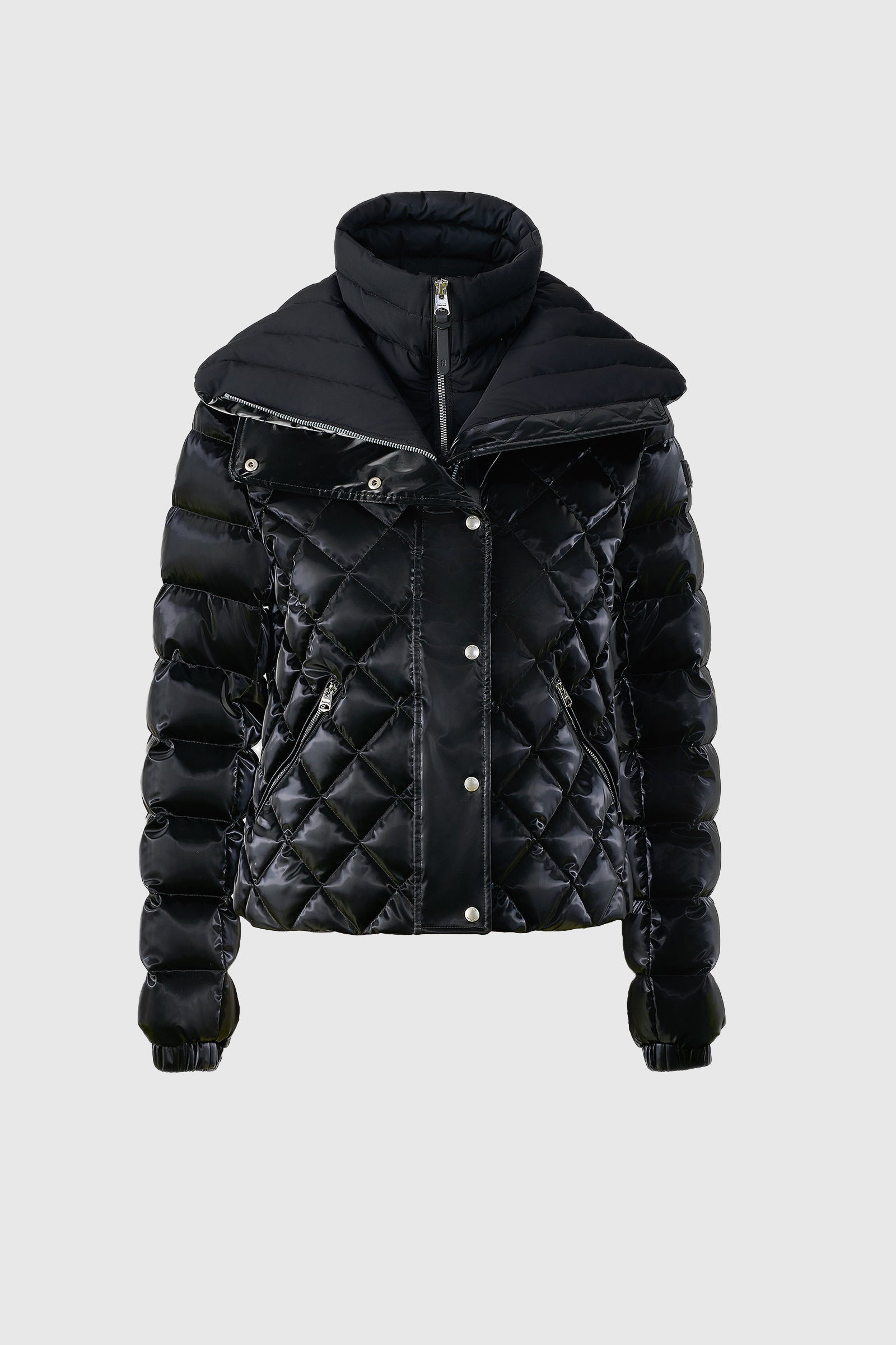 YVETTE-GLO is a diamond-quilted down jacket with a removable lightweight bib and a high-gloss shell. Recycled and water-resistant, it features an adjustable bungee hem and rib knit cuffs for a refined performance silhouette. A bold cold-weather layer designed for lightweight insulation and standout appeal. DETAILS - Quilted down jacket with removable bib - High-gloss shell - Water-repellent, resistant, and windproof - Temperature Rating: -10°C - Diamond quilted body and sleeves - Removable bib in lightweight down - Wide sculptural collar - Center front zip closure with PU snap tape and placket - Adjustable bungee cord at hem - Insulated zip waist pockets - Inner welt pocket with zipper - Rib knit cuffs - Embroidered eyelets at underarm for ventilation - Signature M logo embossed patch on left sleeve - Regular fit SIZE & FIT - REGULAR – Classic fit allowing comfort and style. - Designed to be worn with heavier layers. - The model is 5'11" (180 cm) and wears a size S. - Coat length from shoulder to hem: 21'' / 69 cm. COMPOSITION & CARE - Shell: 100% polyurethane. Lining: 100% recycled nylon. Filling: 85% recycled down, 15% recycled feathers. Water-repellent, water-resistant. - Close zippers. Remove fur. Remove all removable trims. Wash in domestic machine in water not exceeding 30°C at delicate gentle setting. Wash inside out. Use mild detergent. Remove immediately after washing. Do not soak. Tumble dry at low heat with tennis balls until fully dried (1 to 3 hours). Do not wet-clean. Do not bleach. Do not wring. Do not iron or press. Do not steam. Do not dry clean.