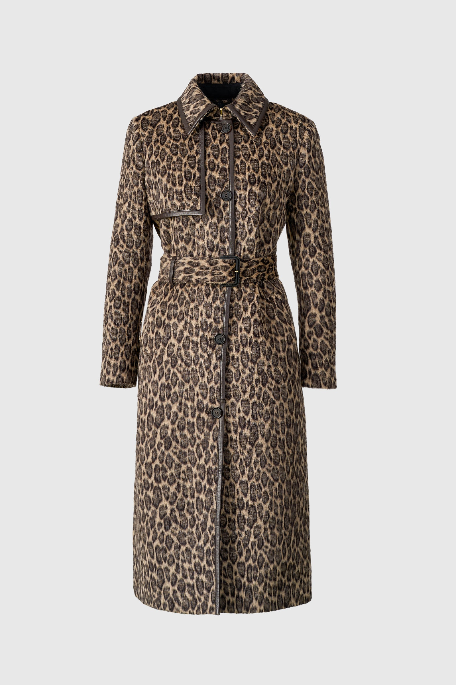 ZEVA-A is a long single-breasted wool coat with animal print pattern throughout. Crafted from a blend of alpaca wool and finished with refined leather tape detailing, this statement coat features an adjustable belt with buckle to cinch the waist and welt pockets for utility. Fully lined for comfort and warmth, rated for temperatures down to -5°C. DETAILS - Long single-breasted wool coat - Responsibly-sourced wool - Leather tape detailing - Adjustable belt with buckle - Button front closure - Welt pockets - Fully lined - Vent opening at back with button - Temperature rating: -5°C SIZE & FIT - SEMI-FITTED – Follows your body’s shape with ease. - Designed to be worn with light layers. - The model is 5'11" (180 cm) and wears a size S. - Coat length from shoulder to hem: 45.5'' / 69 cm. COMPOSITION & CARE - Shell: 70% wool, 20% alpaca, 10% polyamide/nylon. Lining: 52% polyester, 48% viscose. - Dry clean by leather specialist using oil based solvent only. Do not use perchloroethylene.
