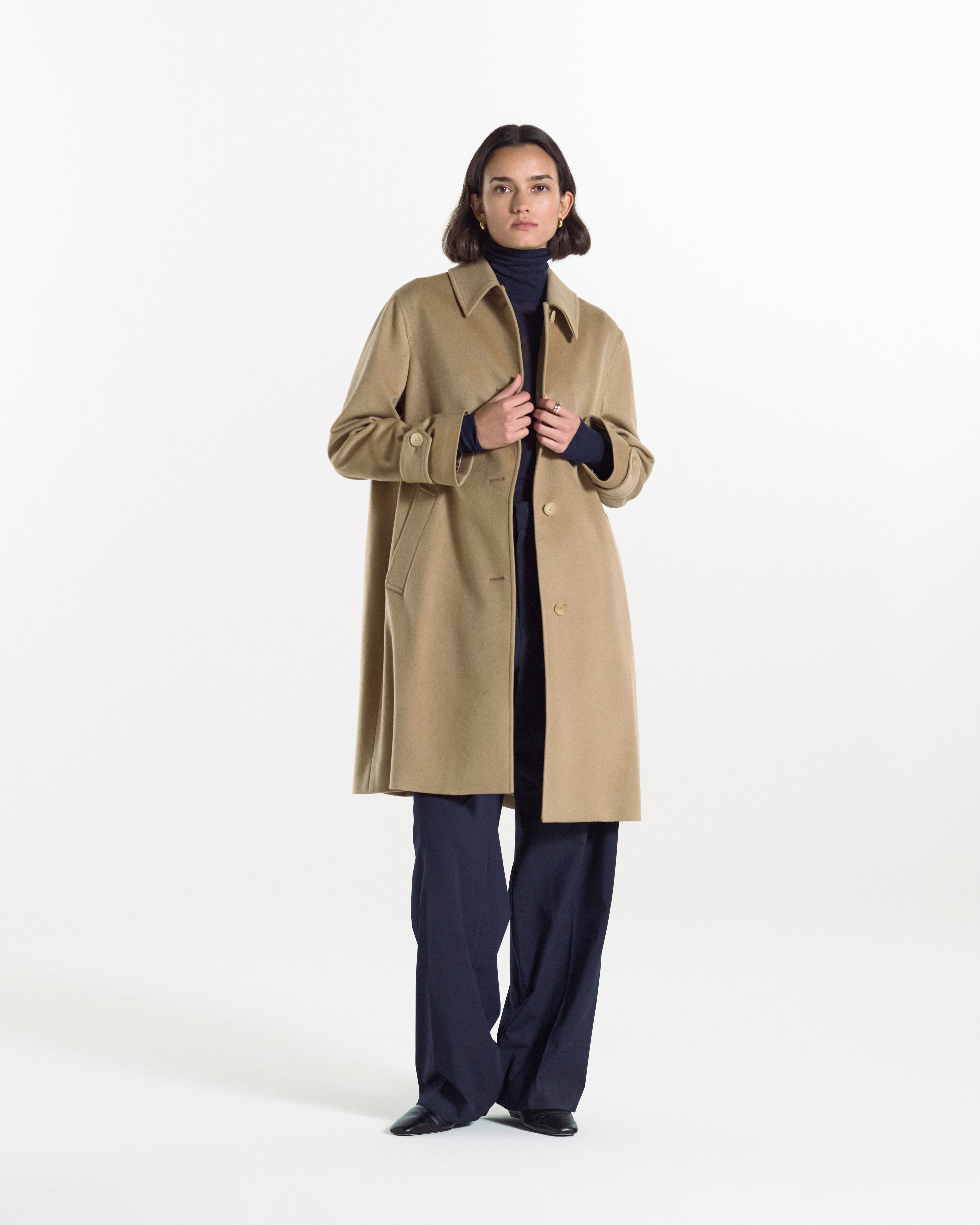 The Banton Cashmere Coat is Mackintosh's ladies signature Banton model. Its beautifully gentle A-line silhouette offers a timeless design that transcends trends. This piece is crafted from Loro Piana's finest 100% cashmere fabric, exuding a luxurious aura. Made in: Japan Fabric: Loro Piana Rain System 100% Cashmere Attributes: Water resistant. Dust resistant. Stain resistant Detailing: Removable neck latch. Cuff tabs Item code: OC1390 SIZE & FIT Fit: Regular Model: Olivia is wearing a UK size 8. Height: 176cm. Dress size: UK 6. Bust: 76cm. Waist: 61cm. Hips: 92cm FABRIC & CARE Composition: 100% Cashmere Washing: Gentle Dry Clean