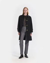 This classic coat in black is made of densely woven wool, making it both light and comfortable for the Spring season whilst simultaneously offering a beautiful A-line silhouette that is always in style. The fabric is sourced from high quality raw materials and treated with our unique nano treatment to offer a water repellent finish. Fabric: Wool Attributes: Water repellent finish. Made of densely woven wool. Made from high-quality raw materials Detailing: Branded buttons. A-line silhouette. Light fabric for the Spring season Item code: OC0589 SIZE & FIT Fit: Regular Model: Holly is wearing a UK size 8. Height: 179cm. Dress size: UK 6. Bust: 79cm. Waist: 60cm. Hips: 89cm FABRIC & CARE Composition: 100% Wool Washing: Dry clean only