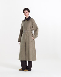 The Belted Bowland is an oversized, belted stand-fall collar coat. This piece blends an authentic design with a voluminous A-line silhouette and maxi length. The supple lamb leather on the collar and waist belt adds a luxurious touch. The leather collar is detachable, and the waist belt is reversible. Made in: Japan Fabric: Wool Alpaca Blend Detailing: Oversize style coat. Contrasting collar and waist-belt. Maxi-length style. Detachable leather collar Item code: OC1007 SIZE & FIT Fit: Oversized Advice: Fits large, choose a size down. Model: Candice is wearing a UK size 8. Height: 178cm. Dress size: UK 6. Bust: 81cm. Waist: 61cm. Hips: 88cm FABRIC & CARE Composition: 78% Wool, 22% Alpaca Washing: Hand Wash