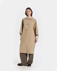 Alongside its oversized silhouette, soft accent details elevate the minimalist design including branded metal buttons and colour block lining. Featuring our rubberised fabric, the coat is also completely waterproof, with hand-taped seams. Made in: Handmade in Scotland Fabric: Rubberised bonded cotton Attributes: Waterproof windbreaker. Hand-taped seams. Suitable for 3 seasons Detailing: Branded metal buttons. Colour block lining. Cocoon silhouette. Cropped sleeves Item code: RO6561 SIZE & FIT Fit: Regular Model: Jensen is wearing a UK size 8. Height: 170cm. Dress size: UK 6. Bust: 86cm. Waist: 62cm. Hips: 93cm FABRIC & CARE Composition: 100% Cotton Bonded Washing: Spot clean only. Do not machine wash. Do not dry clean. Day to day: Small marks can be removed with soap and water. Apply soap with a soft brush only. Never use spirit or any other chemical cleaners.
