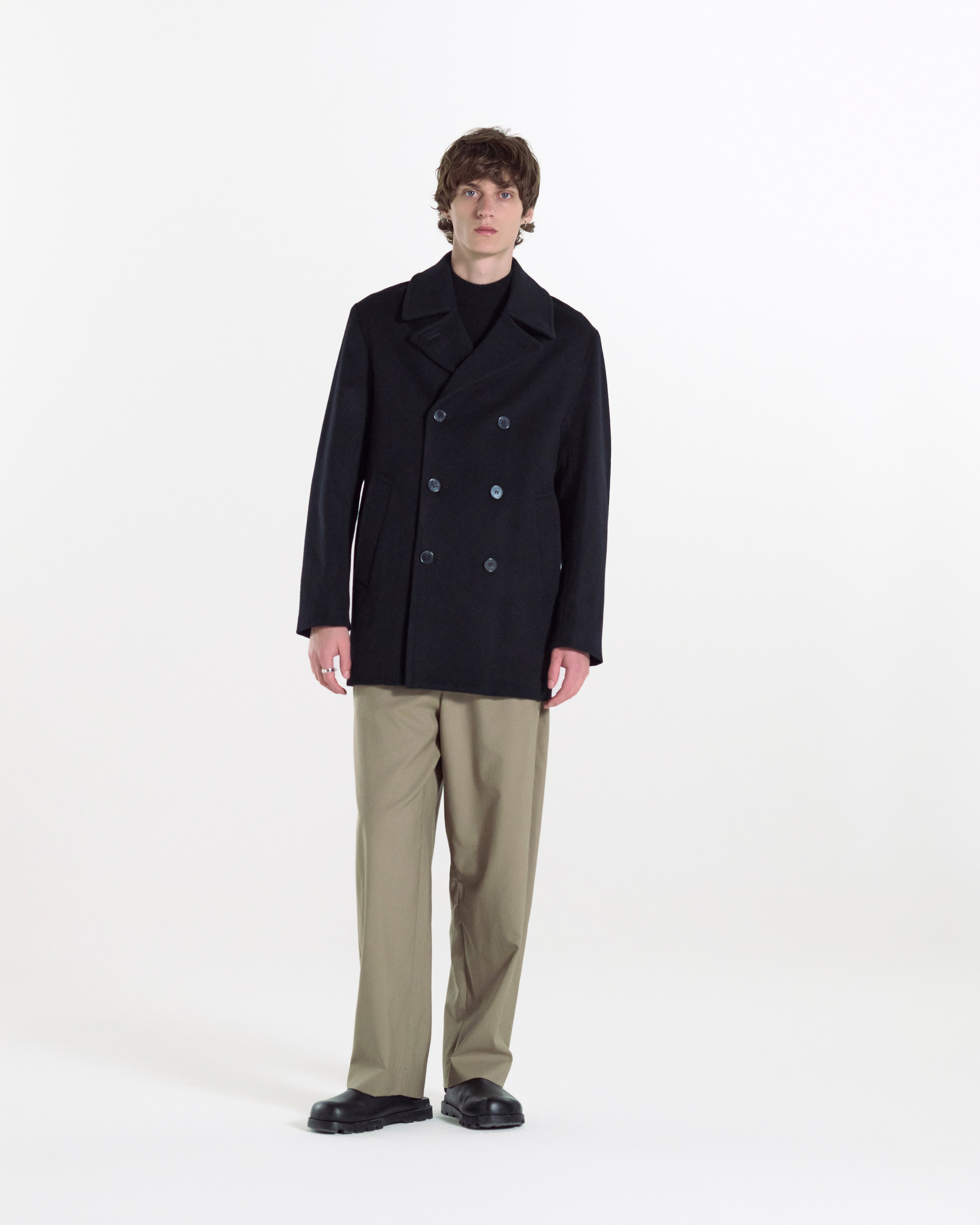 The Dalton pea coat offers a modern and sharp impression. This piece utilises a three-dimensional pattern, similar to a tailored jacket, to combine a beautifully slender silhouette with ease of movement. Made in: United Kingdom Fabric: Wool Cashmere Blend Item code: OC0701 SIZE & FIT Fit: Regular Model: Adam is wearing a UK size 40. Height: 188cm. Chest: 97cm. Waist: 78cm FABRIC & CARE Composition: 90% Wool 10% Cashmere Washing: Dry clean only