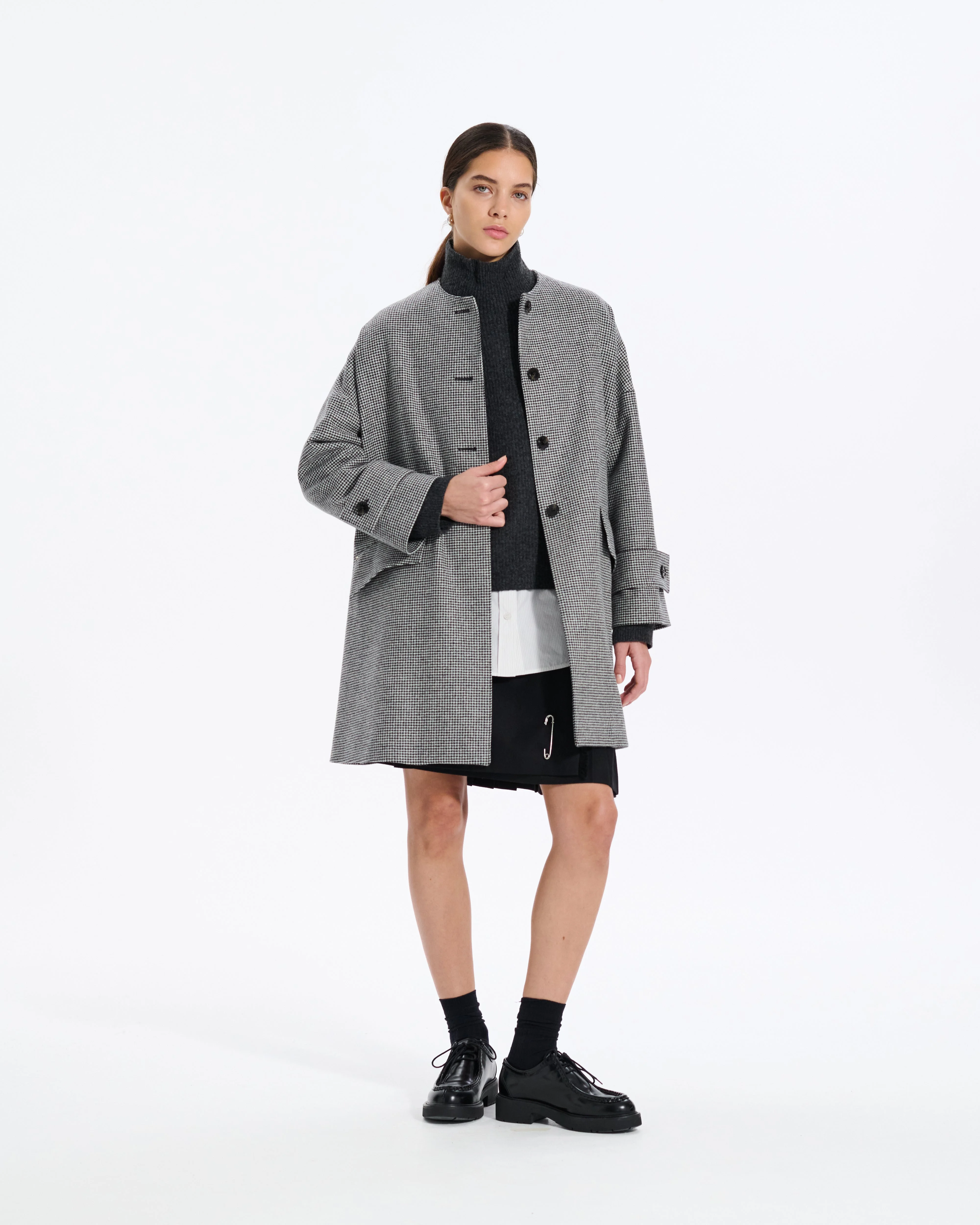 This Humbie is the collarless version of Mackintosh's signature HUMBIE model. It retains the HUMBIE's characteristic A-line silhouette, but with a beautifully defined neckline, offering a more feminine impression. Made in: Japan Fabric: Wool Item code: MO9275 SIZE & FIT Fit: Regular Model: Thais is wearing a UK size 8. Height: 176cm. Dress size: UK 6. Bust: 77cm. Waist: 58cm. Hips: 87cm FABRIC & CARE Composition: 100% Wool Washing: Dry clean only