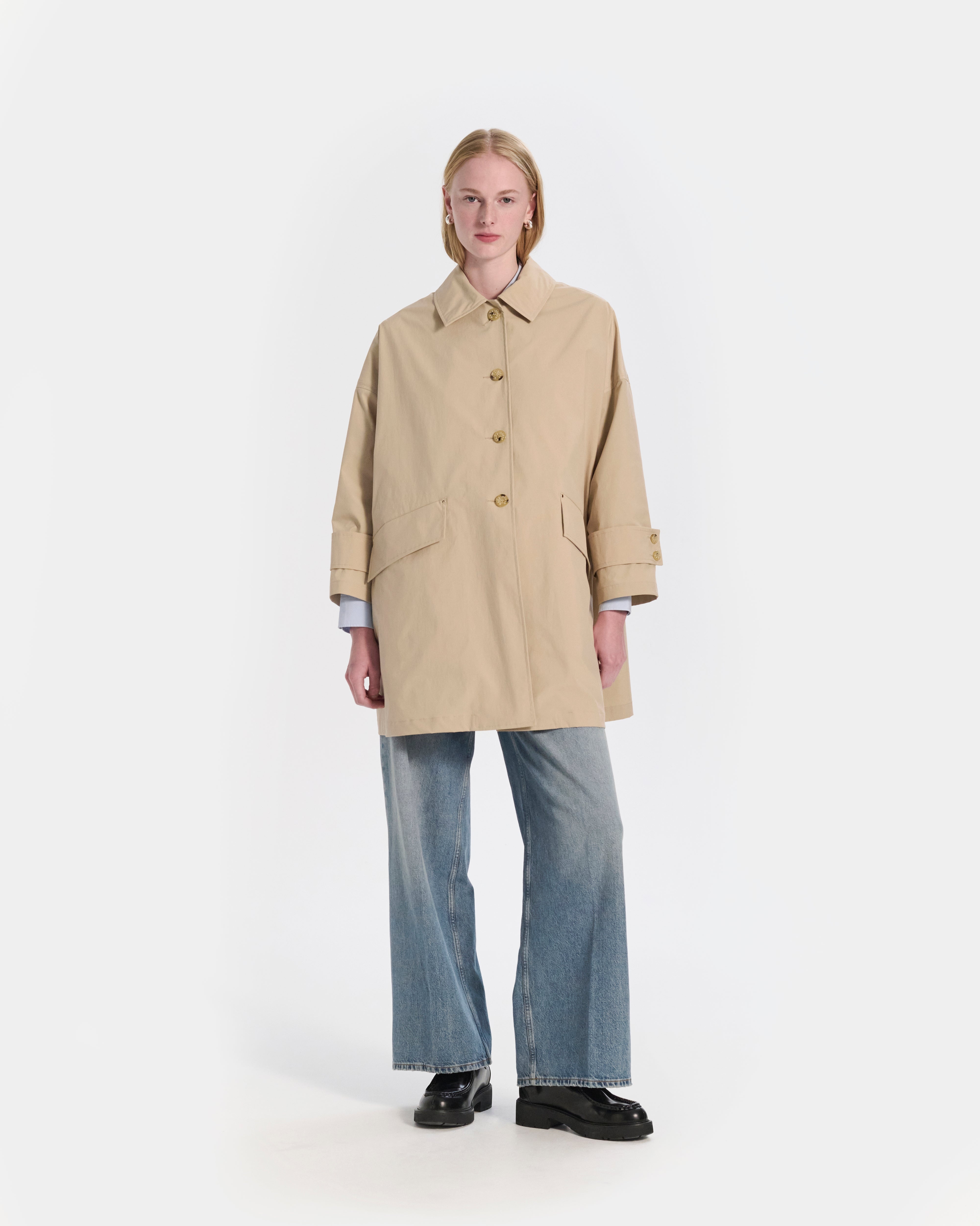 Our Humbie in a super-cool. oversized silhouette. Made in Japan, from recycled materials, and features a water repellent finish to shrug off the off shower. Made in: Japan Fabric: 60% recycled polyester Attributes: Oversized. Neck latch. Water repellent Item code: MO9162 SIZE & FIT Fit: Oversized Model: Holly is wearing a UK size 8. Height: 179cm. Dress size: UK 6. Bust: 79cm. Waist: 60cm. Hips: 89cm FABRIC & CARE Washing: Dry clean only Day to day: Do not machine wash. Do not bleach. Do not tumble dry. Warm iron over damp cloth. Gentle dry clean. Do not wet clean