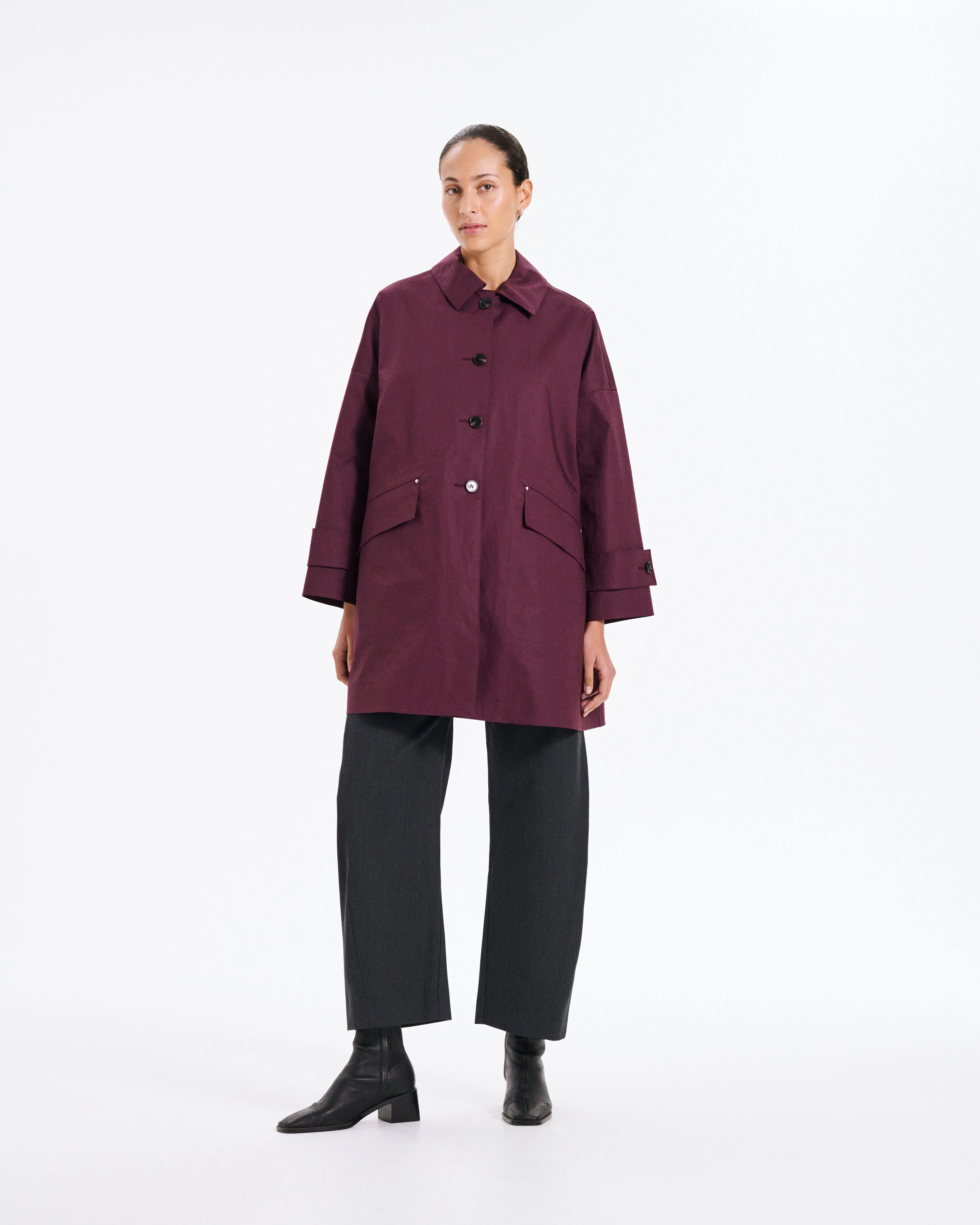 Short balmacaan coat with drop shoulders. An impressive piece with an oversized A line wide silhouette. The modern design stands out with authentic details such as rivet-reinforced flap pockets and a detachable neck latch. Comes with a detachable liner made of soft tweed with an English houndstooth pattern, making it suitable for all seasons. Fabric: Raintec® Attributes: Waterproof. Breathable. Windproof Detailing: Detachable wool liner. Removable neck latch. Cuff tabs Item code: OC1207 SIZE & FIT Fit: Oversized Advice: Fits large, choose one size smaller. Model: Anissa is wearing a UK size 8. Height: 179cm. Bust: 81cm. Waist: 64cm. Hips: 96cm FABRIC & CARE Composition: 100% Cotton Washing: Gentle wet clean. Do not dry clean. Do not machine wash.