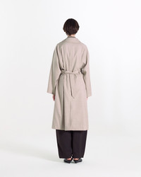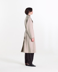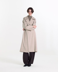 A model that reconstructs a men's military coat into a gown coat that exudes a feminine and elegant mood. This piece has a clean, minimalist design and stands out for its quality materials and tailoring. Made in: Japan Fabric: Attributes: Water repellent Detailing: Waist belt. Slit pockets. Chest pocket Item code: OC0989 SIZE & FIT Model: Candice is wearing a UK size 8. Height: 178cm. Dress size: UK 6. Bust: 81cm. Waist: 61cm. Hips: 88cm FABRIC & CARE Composition: 100% Wool