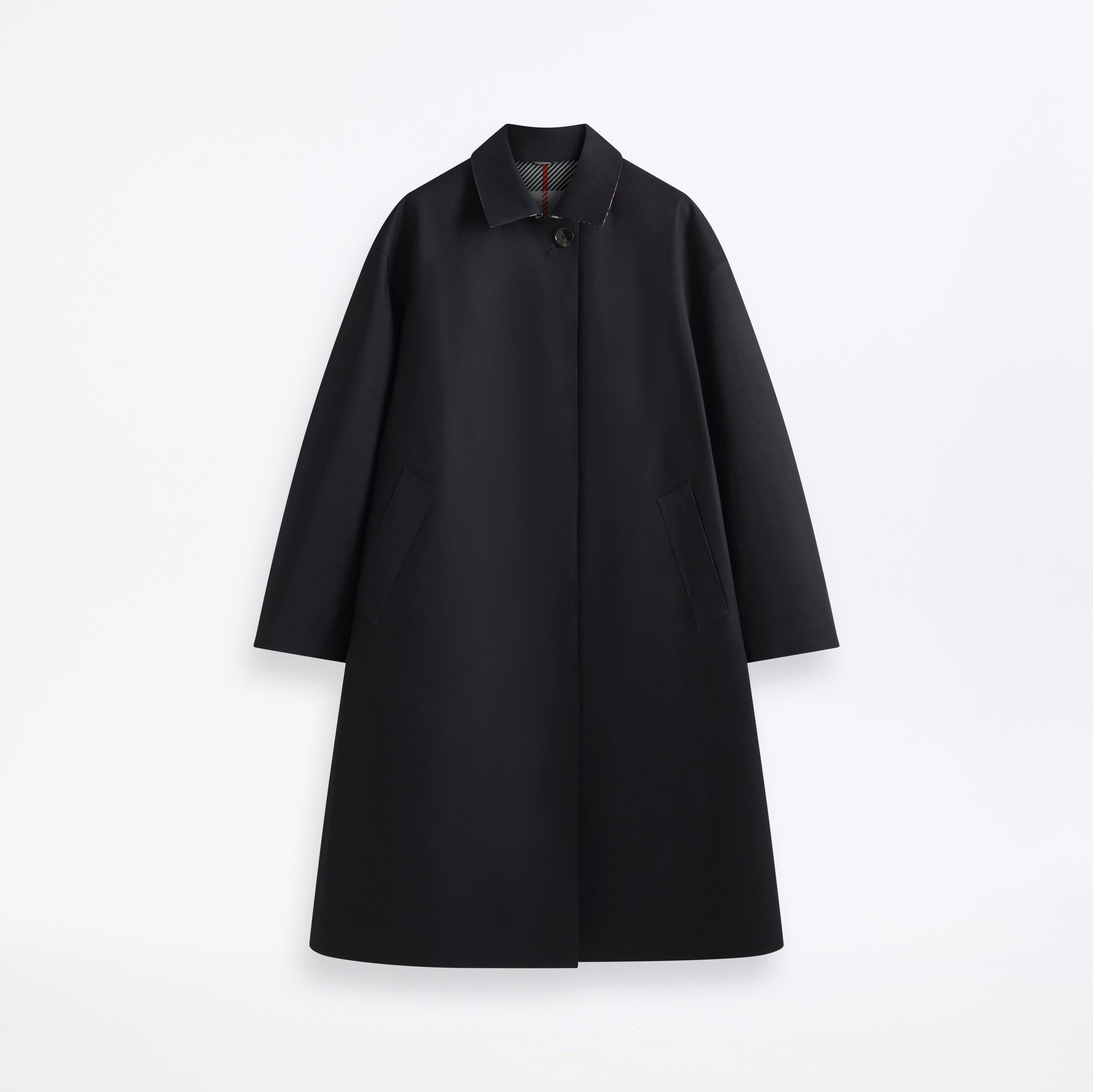 A balmacaan coat with a loose and beautiful A-line silhouette. A tartan check pattern print is used on the back side, making it reversible and wearable Made in: Handmade in Scotland Fabric: Rubberised bonded cotton Attributes: Waterproof. Windproof. Reversible Detailing: Reversible. Concealed button placket. Removable neck latch Item code: RO6644 SIZE & FIT Model: Lottie is wearing a UK size 8. Height: 176cm. Dress size: UK 6. Bust: 76cm. Waist: 61cm. Hips: 92cm FABRIC & CARE Composition: 100% Cotton Bonded Washing: Spot clean only. Do not machine wash. Do not dry clean. Day to day: Small marks can be removed with soap and water. Apply soap with a soft brush only. Never use spirit or any other chemical cleaners.