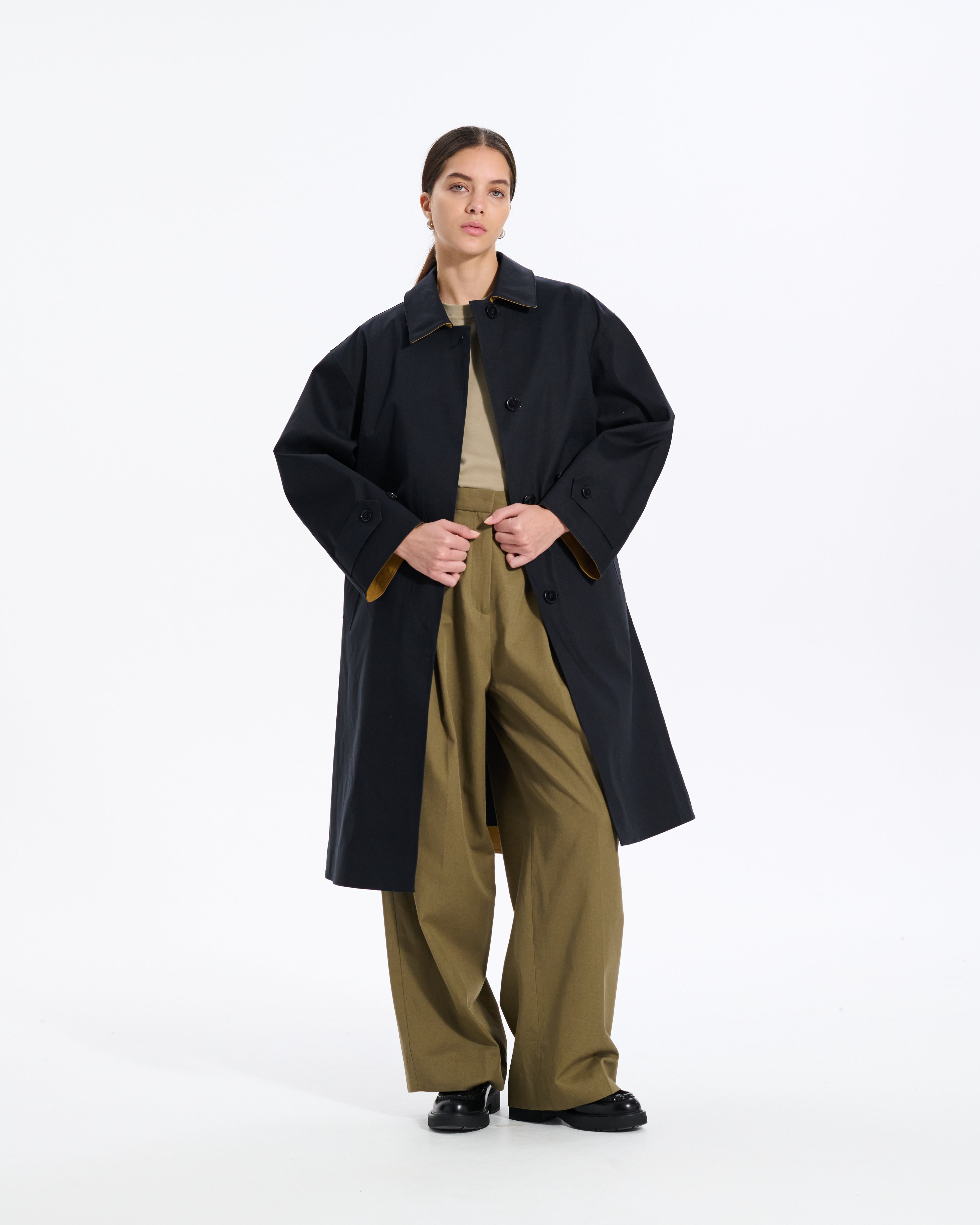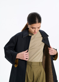 A balmacaan coat with a loose and beautiful A-line silhouette. The minimal design is accented with the colour scheme on the back of the collar and inside the coat. Comes with a removable Harris Tweed liner for all-season wear. Made in: Handmade in Scotland Attributes: Waterproof. Windproof Detailing: Removable neck latch. Harris Tweed Detachable lining. Concealed button placket Item code: RO6640 SIZE & FIT Model: Thais is wearing a UK size 8. Height: 176cm. Dress size: UK 6. Bust: 77cm. Waist: 58cm. Hips: 87cm FABRIC & CARE Composition: 100% Cotton Bonded Washing: Spot clean only. Do not machine wash. Do not dry clean. Day to day: Small marks can be removed with soap and water. Apply soap with a soft brush only. Never use spirit or any other chemical cleaners.