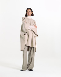 A handmade cape coat made from high quality double-faced material. It has a minimalist design that is light and comfortable, has a beautiful drape, and shows off its high-quality tailoring. Made in: Japan Fabric: Wool Attributes: Handmade Detailing: Pockets. Button fastening Item code: OC1013 SIZE & FIT Model: Olivia is wearing a UK size 8. Height: 176cm. Dress size: UK 6. Bust: 76cm. Waist: 61cm. Hips: 92cm FABRIC & CARE Composition: 100% Wool