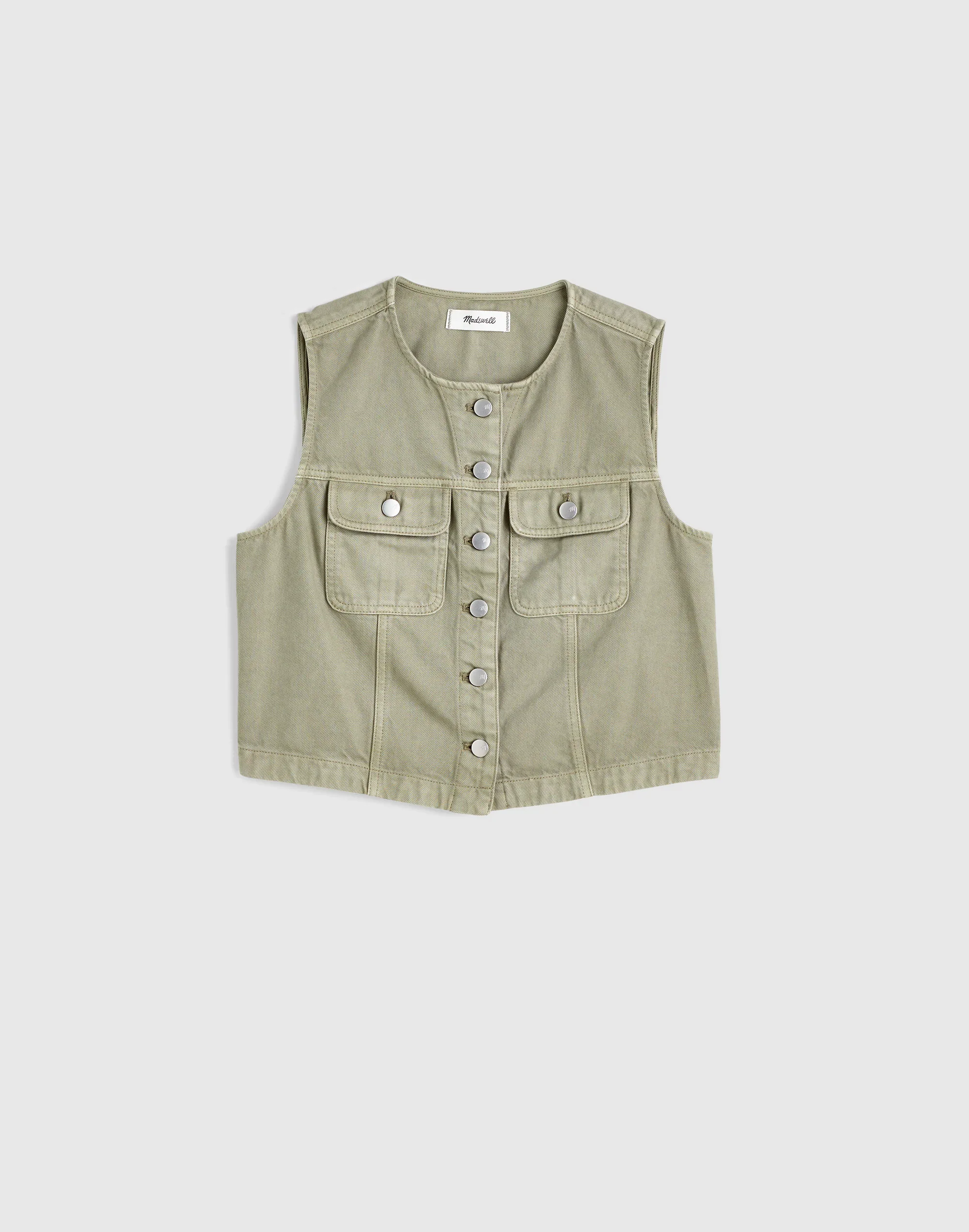 Garment dyed for a soft, lived-in feel, this cropped vest has two flap chest pockets and buttons down the front. Soft and lightweight in Airy Denim, it's ideal all season long—try pairing it with its matching pant. - Cropped fit. - Body length: 19 3/4". - 59% cotton/41% TENCEL™ Lyocell. - Do Well: for each item made at the Fair Trade Certified™ factory, we contribute to a Community Development Fund managed by the workers. - Machine wash. - Imported. - Madewell.com only. - Item OA028