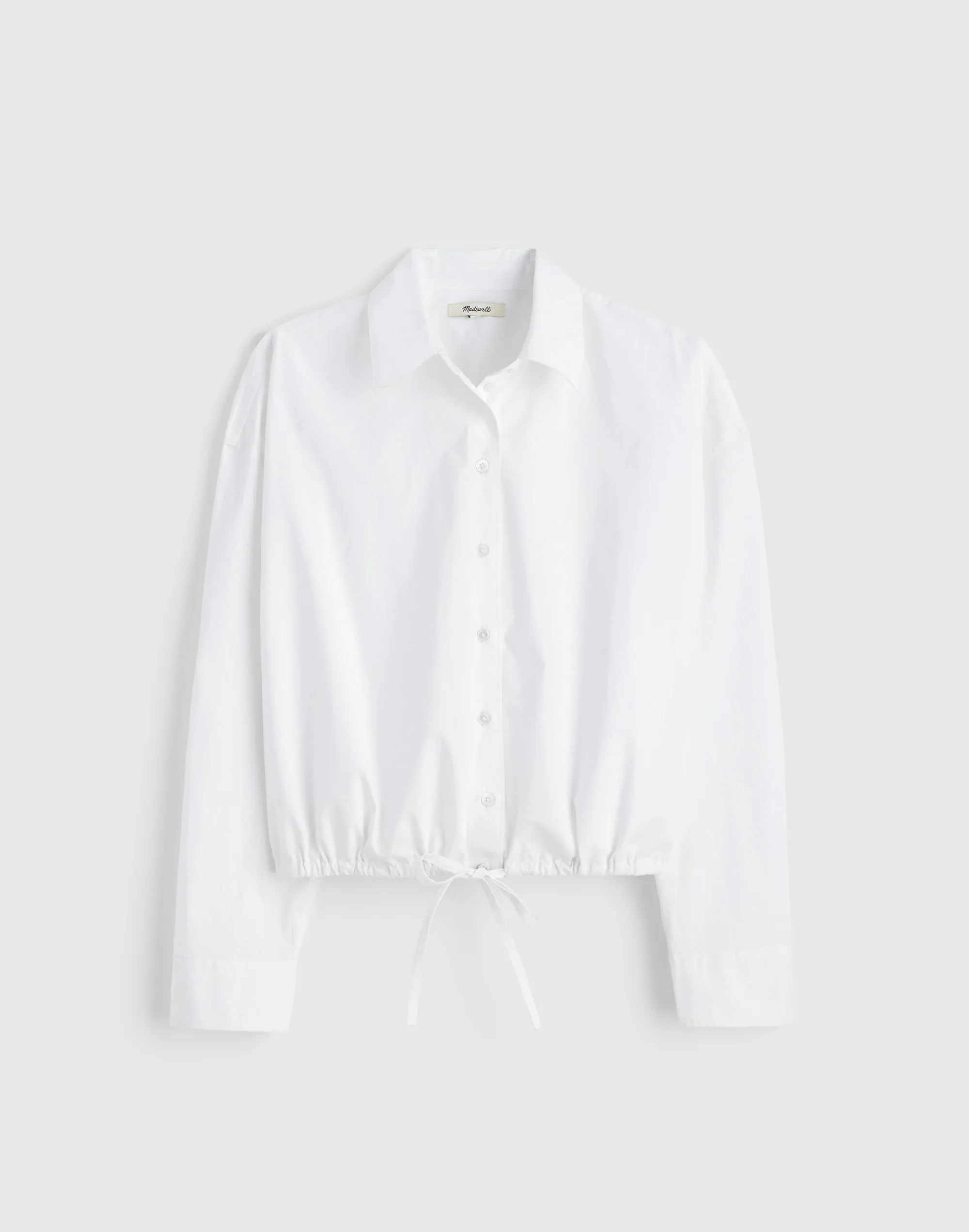 This button-up shirt features contrasting grosgrain ribbon at the placket and an adjustable drawstring hem. Crafted from 100% cotton poplin, it's made to pair with our matching skirt. - Regular fit. - Length: designed to hit between the bellybutton and high hip. - Body length from high point of shoulder: 22 5/8". - 100% cotton. - Machine wash. - Imported. - Item NZ452