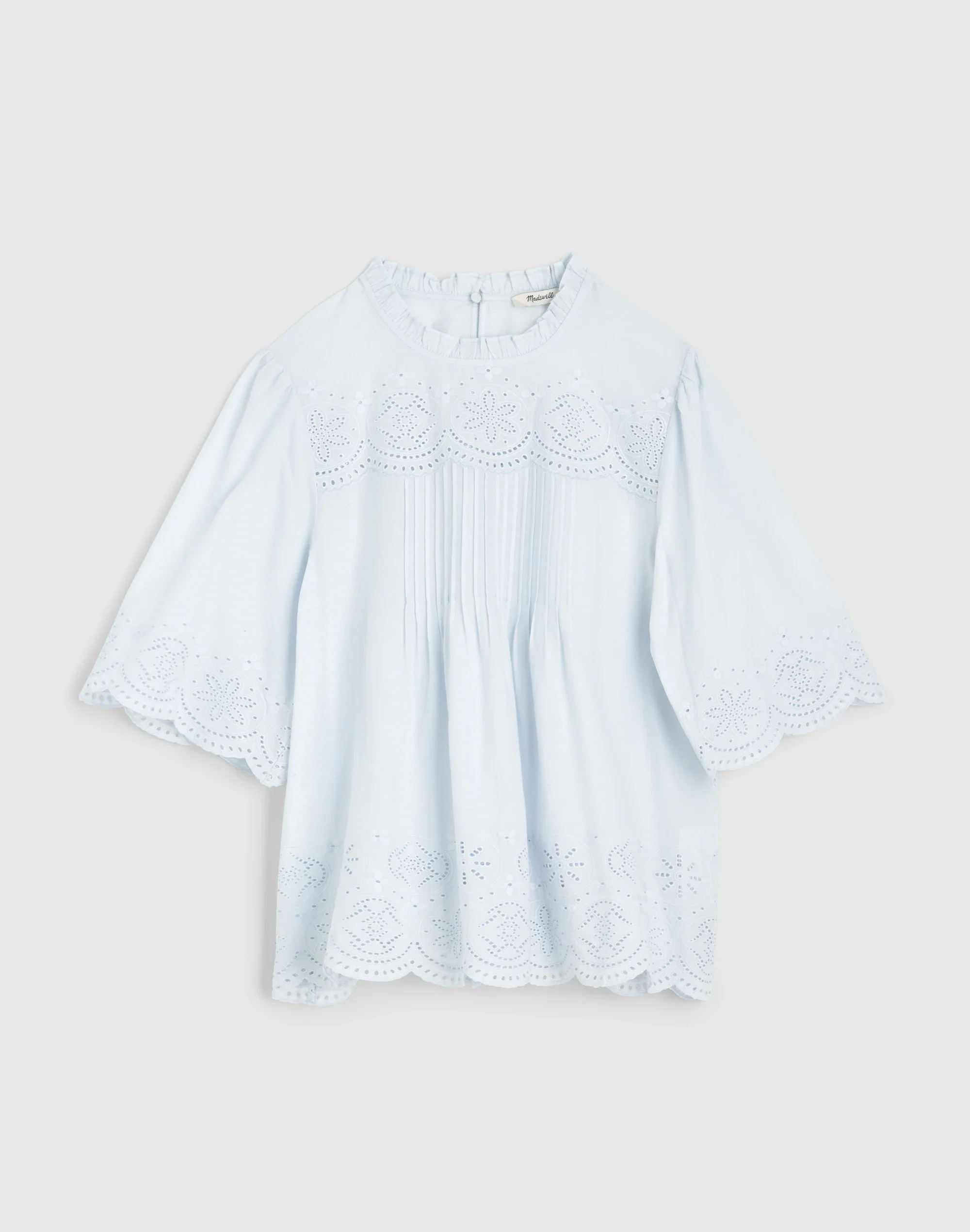 Embroidered with eyelets allover, this airy cotton voile high-neck top has delicate pintucks, voluminous sleeves and scalloped edges. It's perfect when paired with your favorite jeans. - Regular fit. - Hip length: designed to hit at the high hip or below; tuckable. - Body length from high point of shoulder: 24". - 100% cotton. - Machine wash. - Imported. - Item NZ462