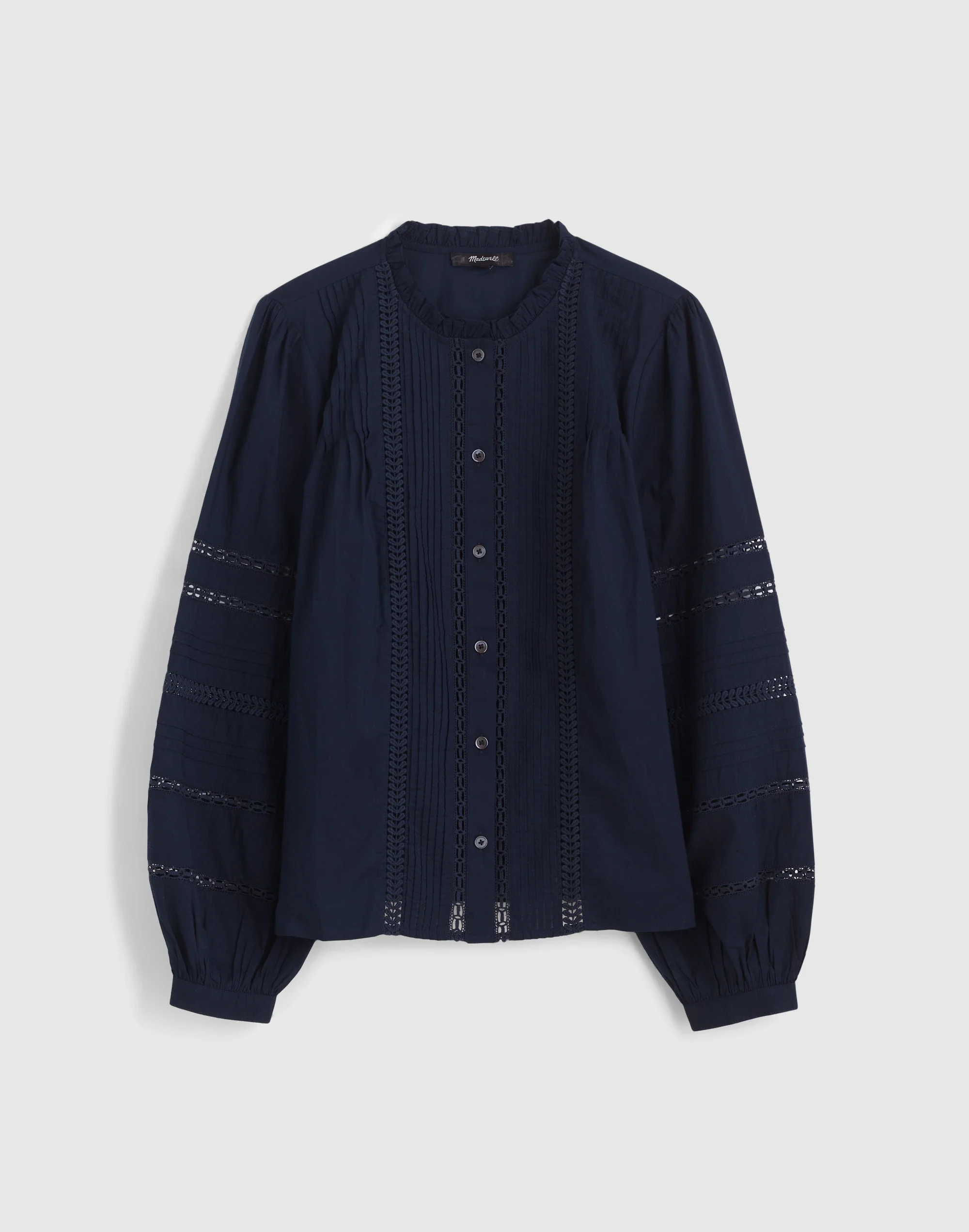 Crafted of a lightweight cotton voile, this long-sleeved top features a ruffled high-neck, intricate lace inserts and delicate pintucks for a vintage-inspired look. With buttons along the front, it's perfect to pair with everything from jeans to a mini skirt. - Regular fit. - Hip length: designed to hit at the high hip or below; tuckable. - Body length from high point of shoulder: 25". - 100% cotton. - Machine wash. - Imported. - Item NZ418