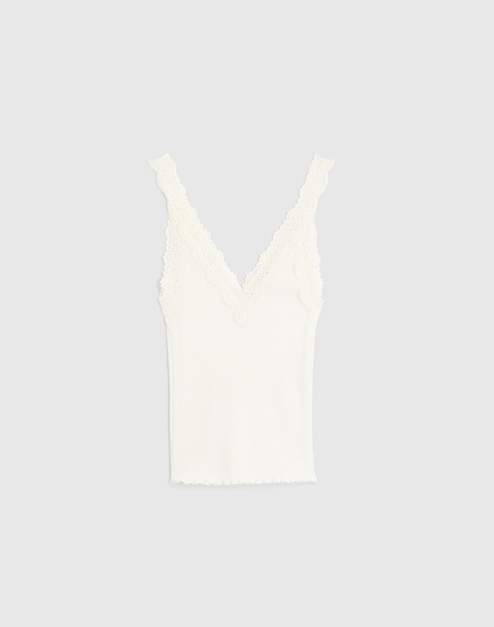 Trimmed with delicate lace, this V-neck tank comes in a ribbed cotton blend. Finished with a lettuce-edge hem, it can be worn layered or on it's own. - Regular fit. - Length: designed to hit between the bellybutton and high hip. - Body length from high point of shoulder: 22 1/2". - 56% cotton/38% TENCEL™ Modal/6% elastane. - Machine wash. - Imported. - Select stores. - Item NZ773
