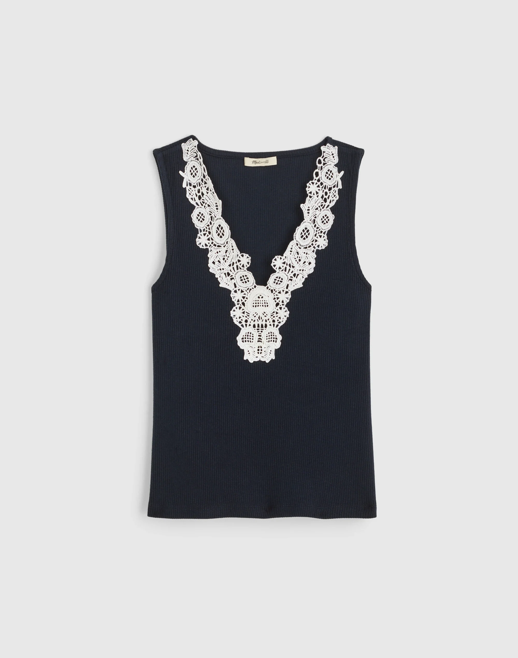 Trimmed with bold lace, this cotton-blend V-neck tank is made to standout on its own. Elevated yet versatile, it's the piece that'll take you from the office to dinner with absolute ease. - Regular fit. - Length: designed to hit between the bellybutton and high hip. - Body length from high point of shoulder: 22 1/2". - 57% cotton/38% TENCEL™ Modal/5% elastane. - Machine wash. - Imported. - Item NZ389