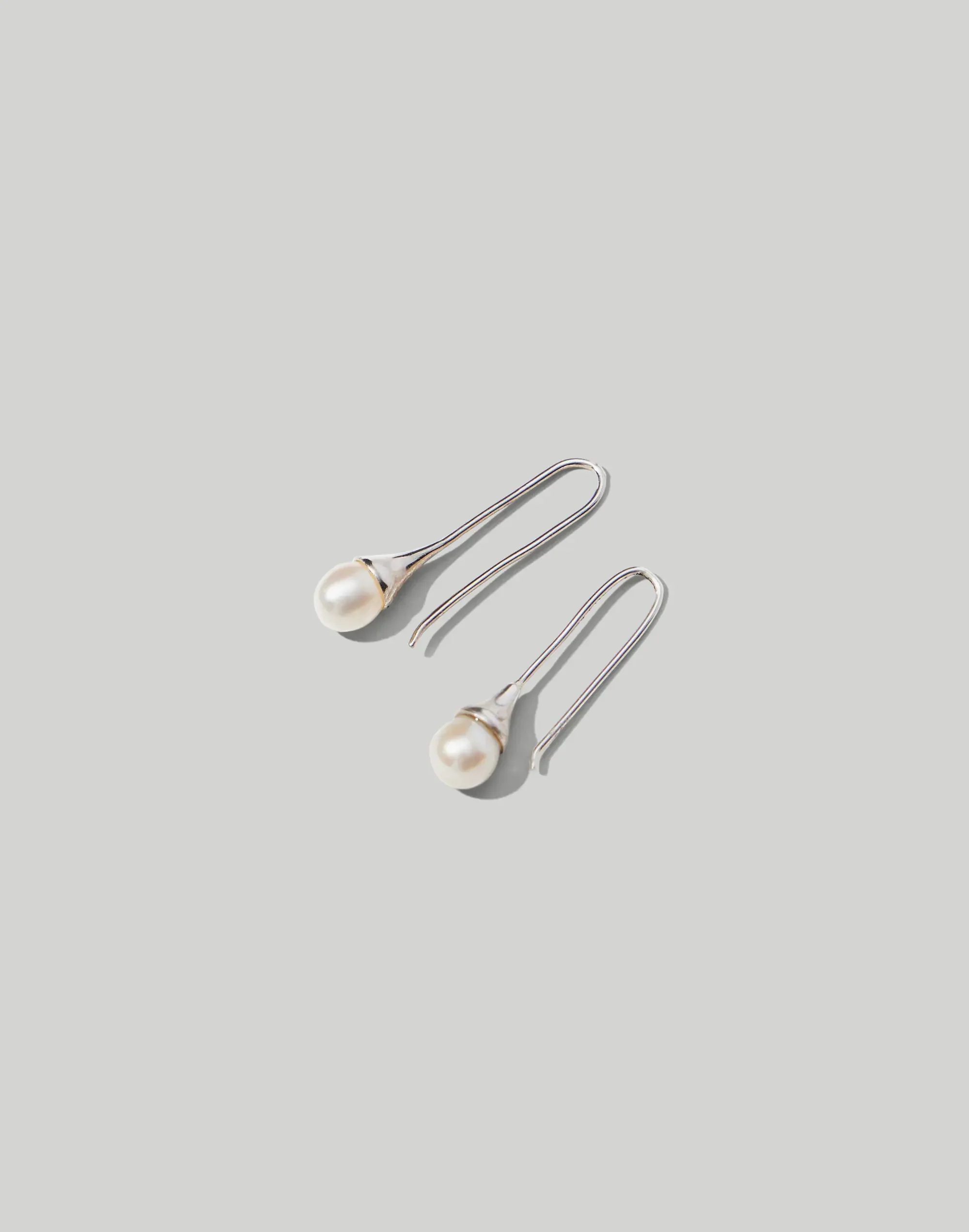 Trained as a graphic designer, founder Nicole Maslowski created Maslo Jewelry with the interest of exploring the texture, weight and balance of accessories. The organic shape of these sterling silver and freshwater pearl earrings are reminiscent of a delicate drop of water. - Length: 2.25". - Please note this piece is hand cast, therefore slight variations may occur due to the casting process. - Sterling silver/ freshwater pearl. - Spot clean. - Made in the USA. - Item N9558
