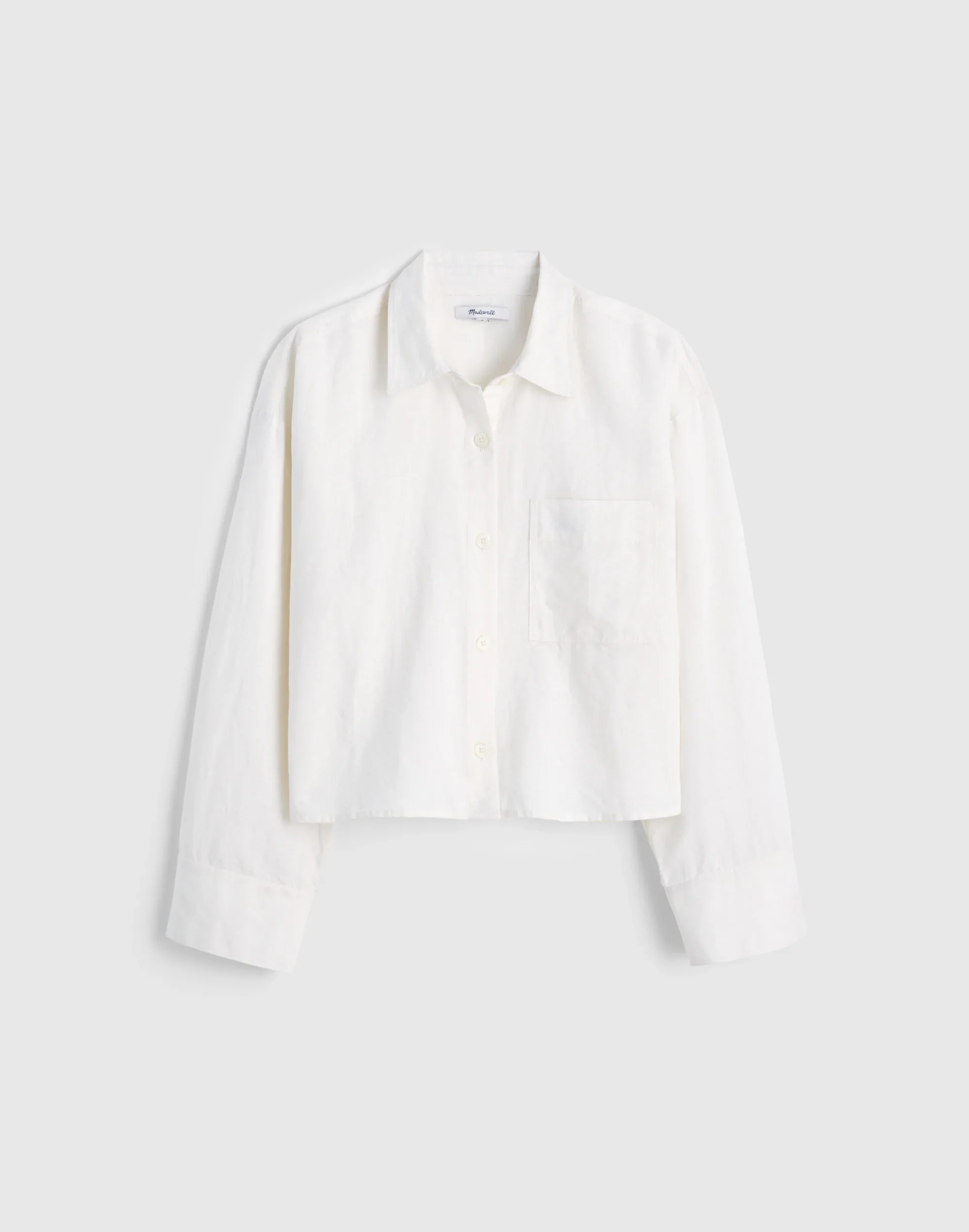 Coming in a lightweight linen-cotton blend, this button-up shirt is finished with a patch pocket at the chest, curved back yoke for a relaxed fit and a straight hem. - Regular fit. - Length: designed to hit between the bellybutton and high hip. - Body length from high point of shoulder: 21 1/2". - 51% linen/49% cotton. - Machine wash. - Imported. - Item NZ468