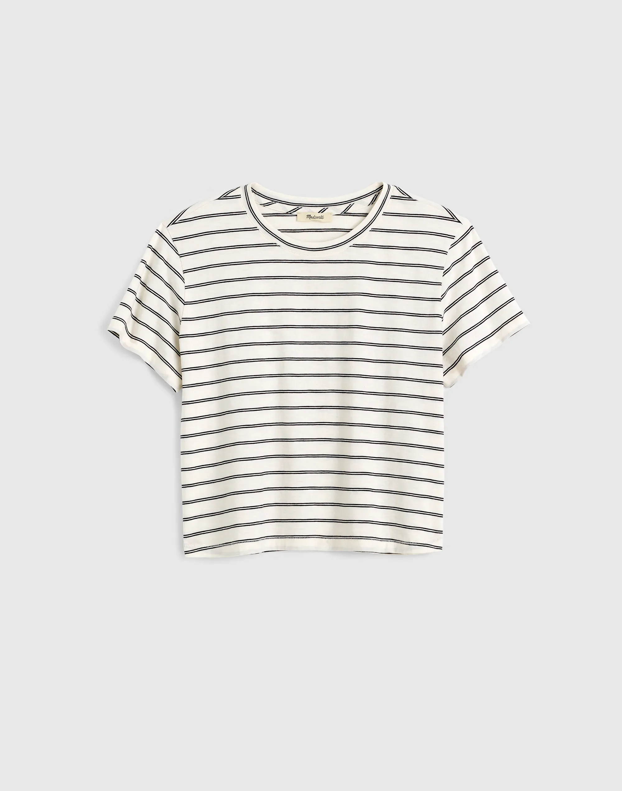 Coming in our best-selling light and airy Soft Slub jersey from Peru, this striped easy crewneck tee is cropped at just the right length to hit the waistband of high-rise jeans. - Easy fit. - Length: designed to hit between the bellybutton and high hip. - Body length from high point of shoulder: 21". - 100% cotton. - Machine wash. - Imported. - Item NS579