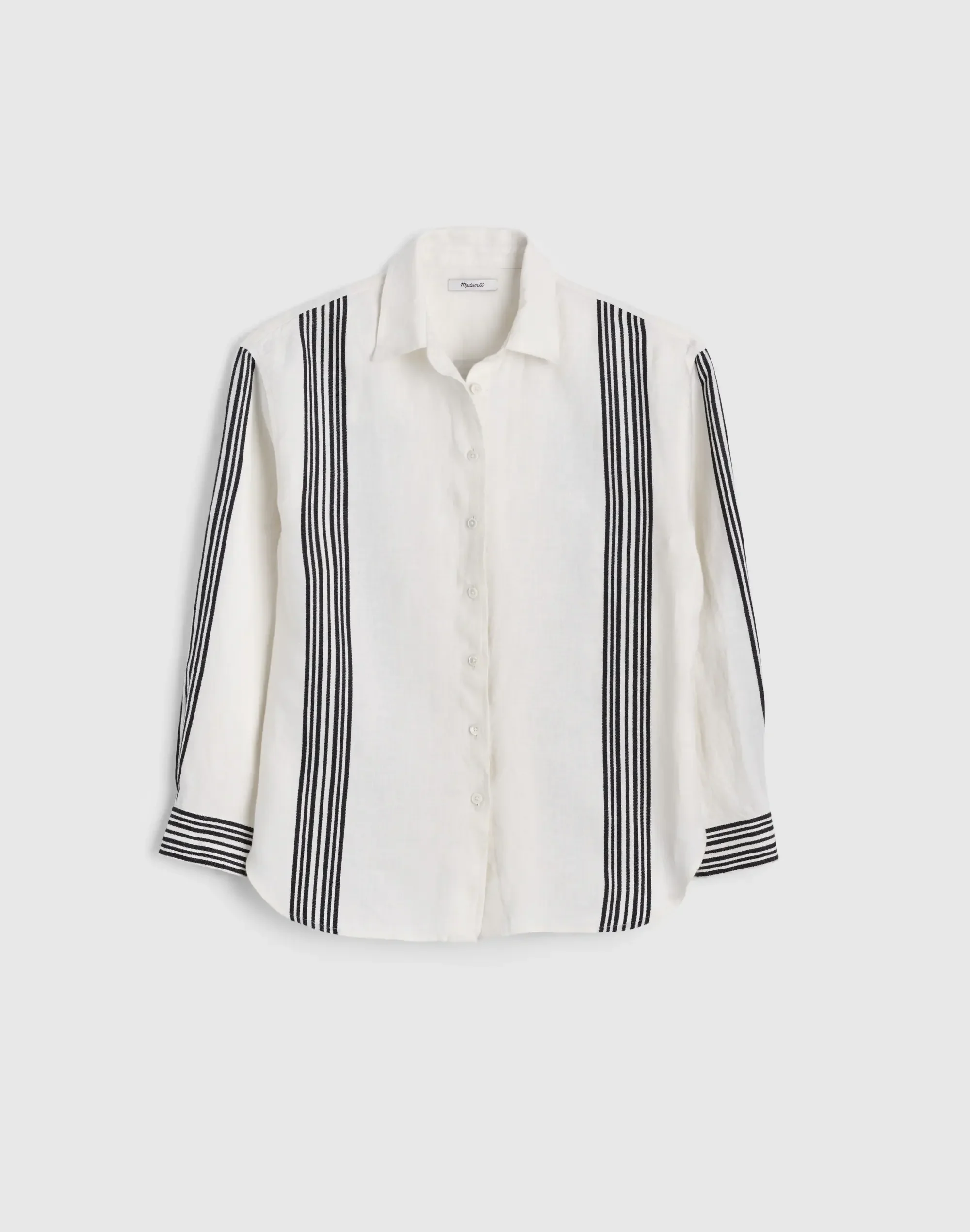 This versatile striped button-up shirt features a classic placket. Easy and elevated, it's cut from a lightweight linen-cotton blend. - Regular fit. - Hip length: designed to hit at the high hip or below; tuckable. - Body length from high point of shoulder: 29". - 93% linen/7% cotton. - Machine wash. - Imported. - Item NZ530