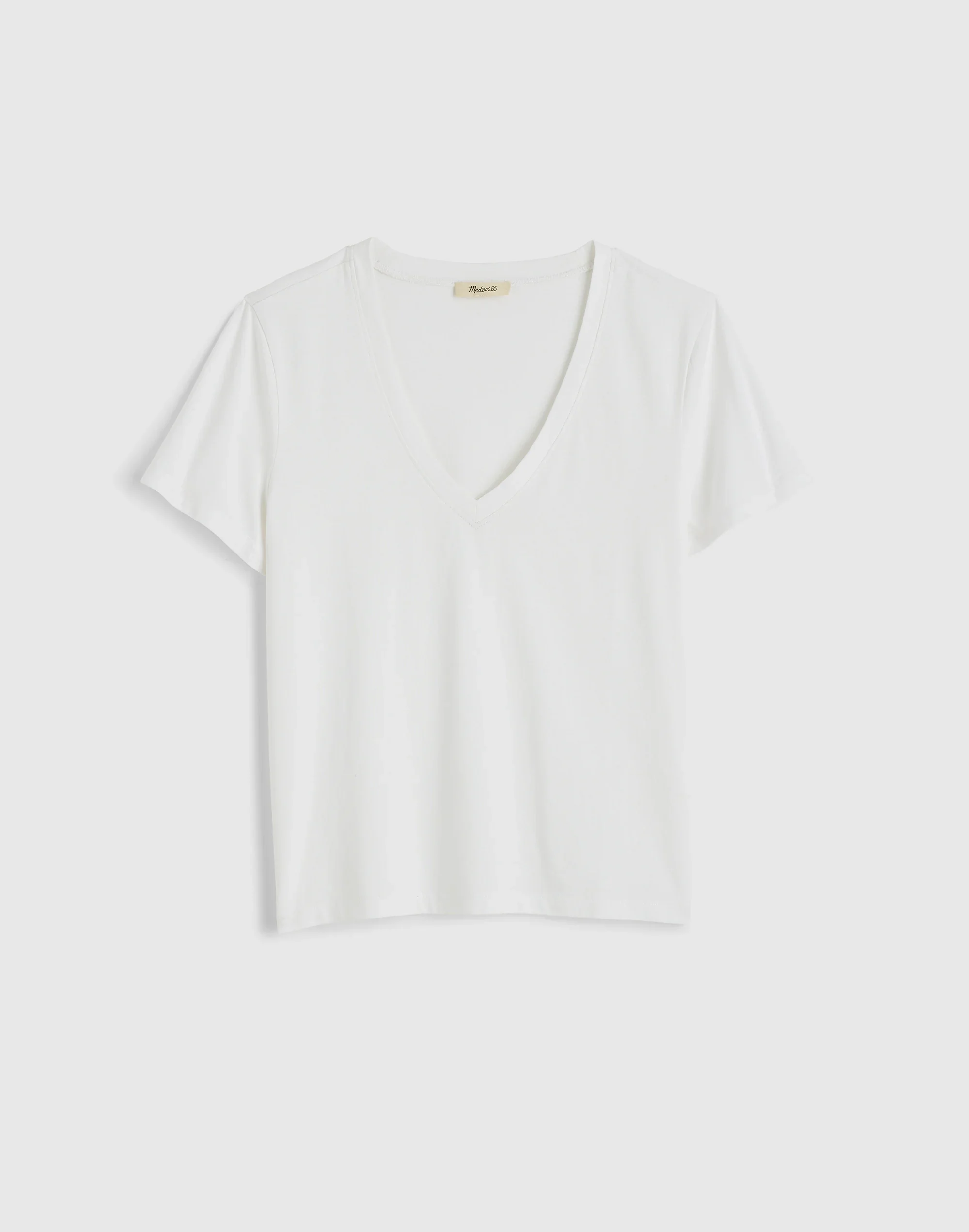 Coming in our signature Allday Jersey, this V-neck tee was designed with a true classic fit. So easy and absolutely essential, especially for fans of our best-selling crewneck iteration. - Regular fit. - Hip length: designed to hit at high hip or below; tuckable. - Body length from high point of shoulder: 23 3/4". - 100% cotton. - Machine wash. - Imported. - Madewell.com only. - Item NX189