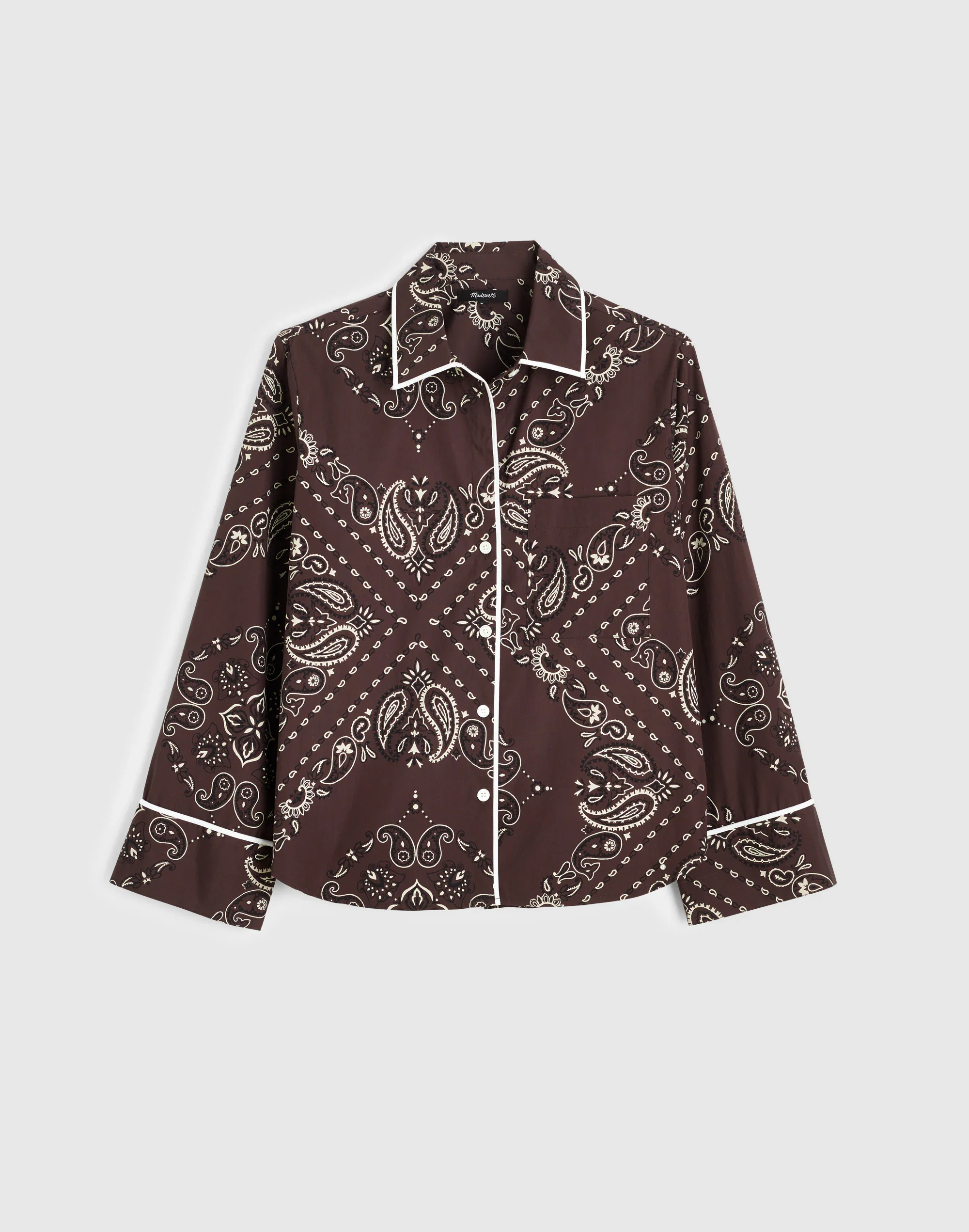 A modern take on a classic pajama shirt, this bandana-print button-up features contrast piping details throughout, plus a point collar with a few buttons on the placket for an intentionally open look. Crafted from a crisp, midweight cotton poplin, it's slightly structured and very versatile. - Regular fit. - Hip length: designed to hit at the high hip or below; tuckable. - Body length from high point of shoulder: 26 1/4". - 100% cotton. - Machine wash. - Imported. - Item NZ678