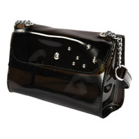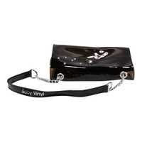 Black Vinyl Shoulder Bag with Magnetic Snap Closure and Rivets Design on Flap Easy to Clean Great for the Beach 5” length 8” width 3” depth Ask me about my design process and inspirations!