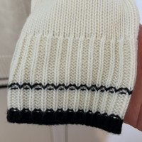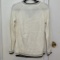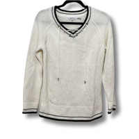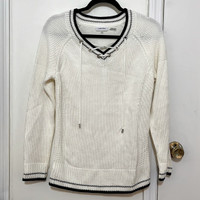 Calvin Klein Beige Sweater with Lace Up Neck Beige Knit with Contrast Black Tipping Silver Grommets along V-Neck neckline Knit Tie for Lace Up Worn a few times only Cozy winter sweater Would be happy to answer questions you may have about this item