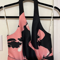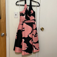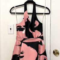 Halston Heritage Black and Pink Floral Halter Cocktail Dress Size 0/ true to size Halter with Closure at Neck Back Zipper Built-in Belt with Hooks Front and Back Pleats on Skirt Side Pockets Fully Lined 39” from shoulder to hem 13” across waist Excellent condition! Great dress for guest of Valentine’s Day, wedding, special occasion, party Would be happy to answer questions you may have about this item