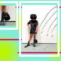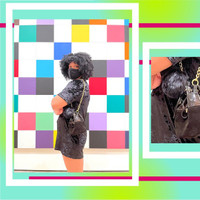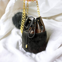 Black Vinyl and Suede Bucket Bag with Pompom and Gold Chain Handle Drawstring Closure Crossbody Chain 6" Wide x 8" High Ask me about my design process and inspirations!