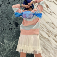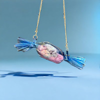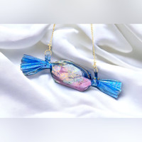 Blue Oil clear slick vinyl Candy shape crossbody Zipper closure Gold Chain strap One of a kind 19” total length, actual bag is 8” x 5” Ask me about my design process and inspirations! Can provide more photos or details upon request