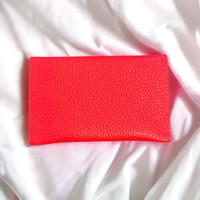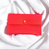 Red Genuine Leather Pinked edge on flap Crystal button closure/“monk head” closure 4” x 2.5” Holds multiple cards Ask me about my design process and inspirations!