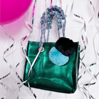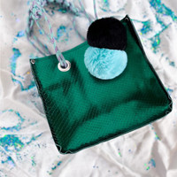Hand Crafted - Handmade Shiny Green Leather Tote with Pompoms