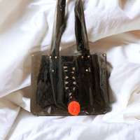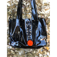 Black Vinyl Cat Tote with Orange 3D PomPom and Appliqué Sequin Cat 12” x 9” x 3” Front has sequin cat applique with PomPom Back side is plain black vinyl One of a Kind Handmade in Brooklyn, NY Maintenance: Use moistened cloth to clean and microfiber cloth to remove oil smudges Would be happy to answer questions you may have about this item