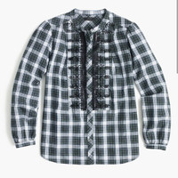 J. Crew Plaid Button Down or Tunic with Black Beading/Embellishments along Placket Blue/green/white/grey/yellow plaid pattern Slightly puffed sleeves Black beading, sequins and mesh ruffle trim along placket Box pleat in back Worn twice Would be happy to answer questions you may have about this item