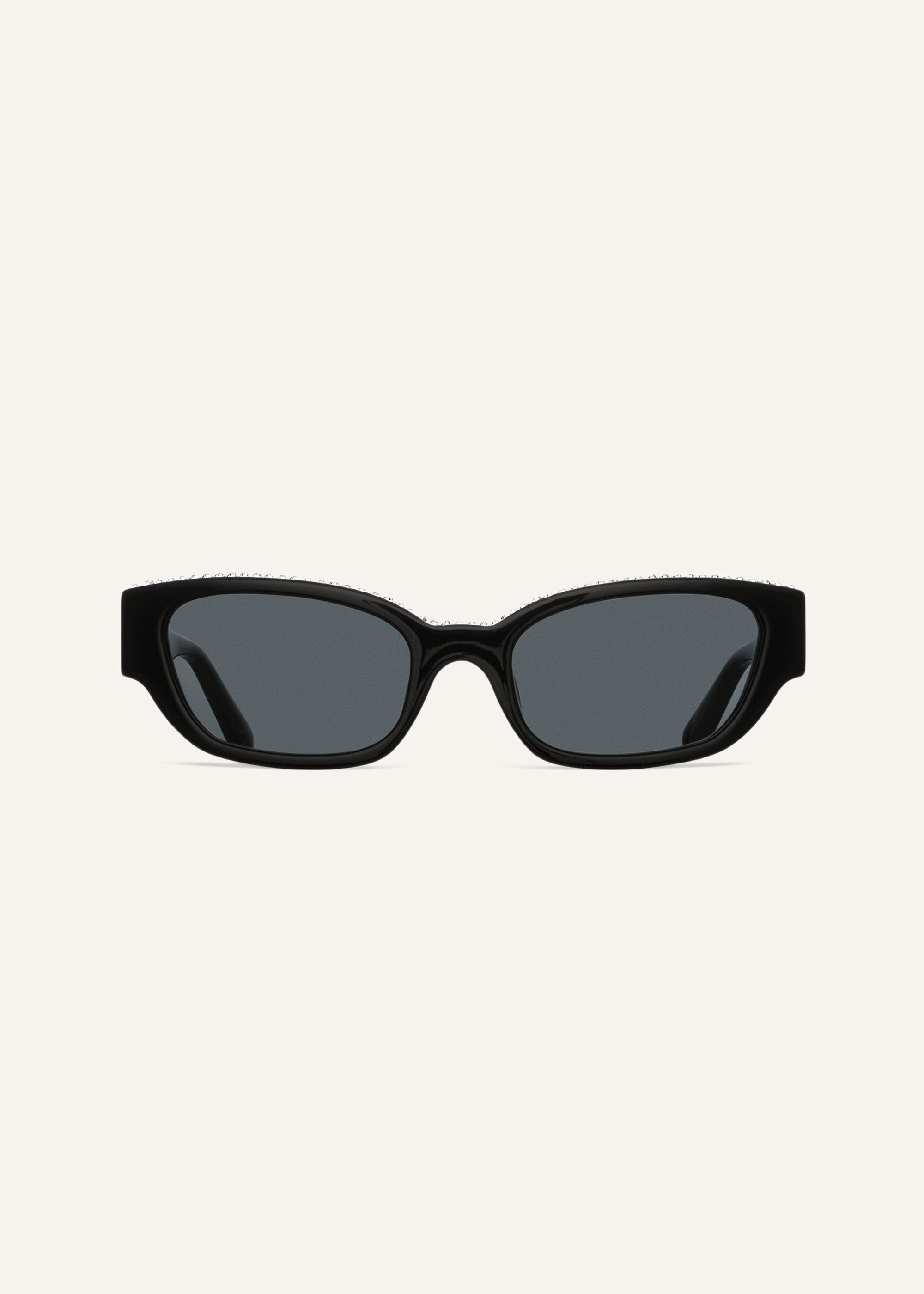 Modern cat-eye silhouette embellished with crystals at the top and logo on the temple. Details ID: 994724 ACETATE. STAINLESS STEEL. NYLON.