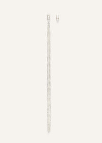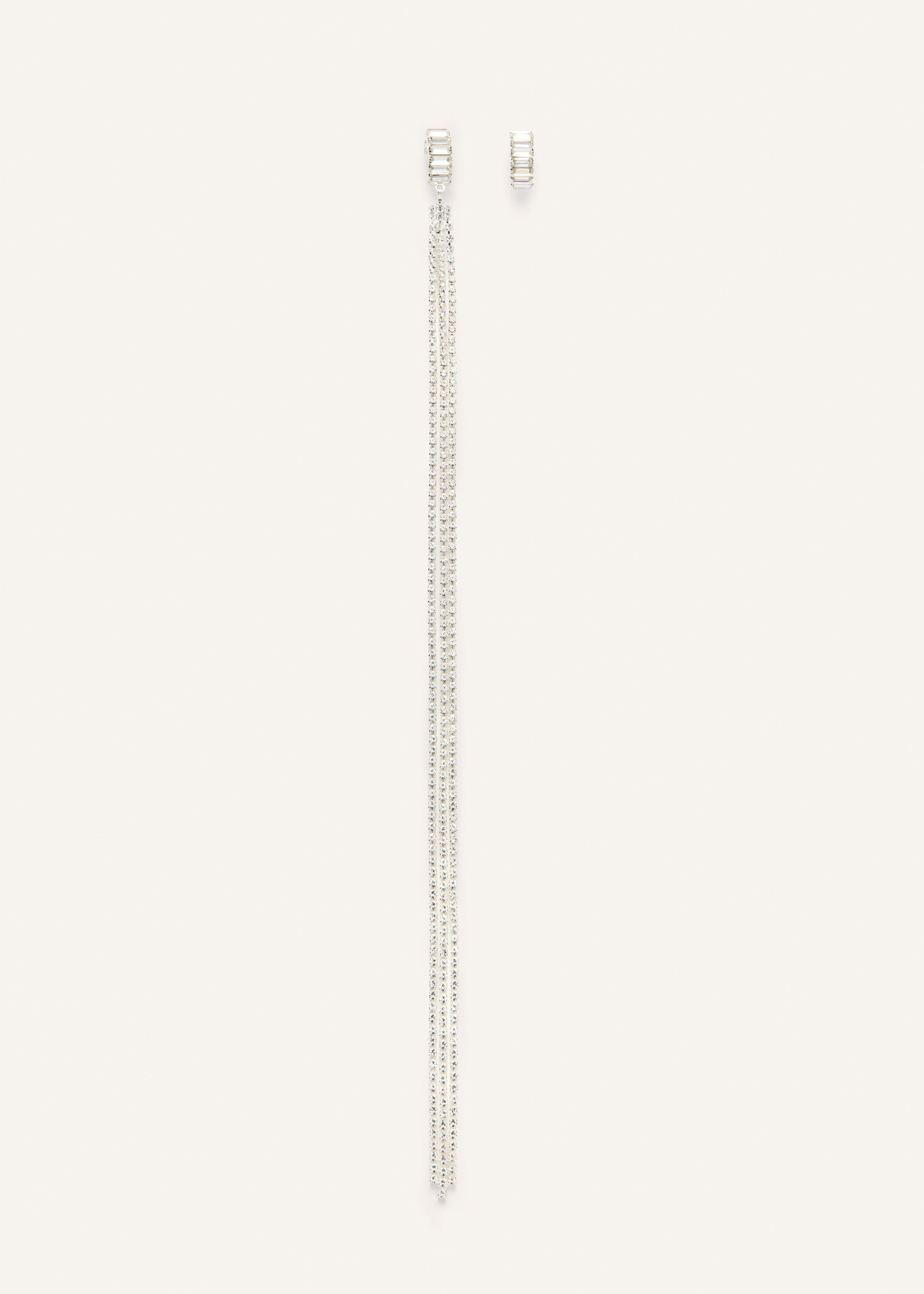 Make a bold statement with these asymmetrical earrings, designed to add dynamic elegance to any ensemble. One earring features cascading crystal tassels that shimmer with every movement, while the other presents a minimalist silver hoop adorned with baguette-cut crystals for a subtle touch of brilliance. Whether worn as a pair or styled separately, these earrings embody modern glamour with a signature edge. Perfect for elevating evening looks or adding a striking accent to minimalist outfits. For pierced ears. Details ID: 713725 Hypoallergenic Plated Brass. Crystals. Sizing Approximate measurements: 35 cm drop.