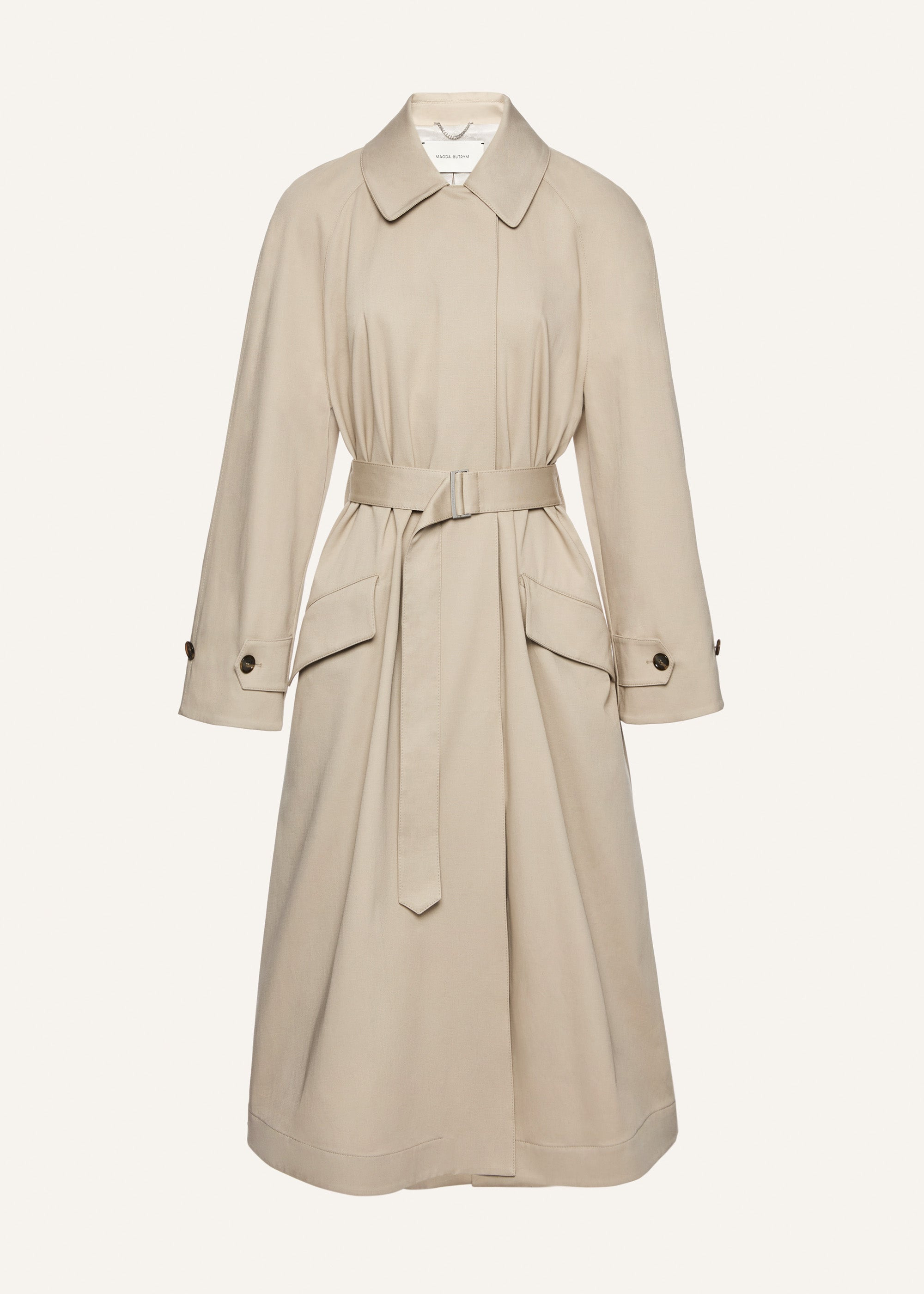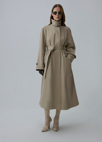 A refined take on outerwear, this long trench coat is crafted from smooth silk for a lightweight, elevated finish. Cut with a classic collar and relaxed raglan sleeves, the coat features buttoned tabs at the cuffs and a belted waist with a matching silk tie. Details ID: 134925 Shell 100% Sheep Leather. Lining 100% Silk. Sizing This piece fits true to size. We recommend you get your regular size. Model is 177 cm and is wearing a size 34.