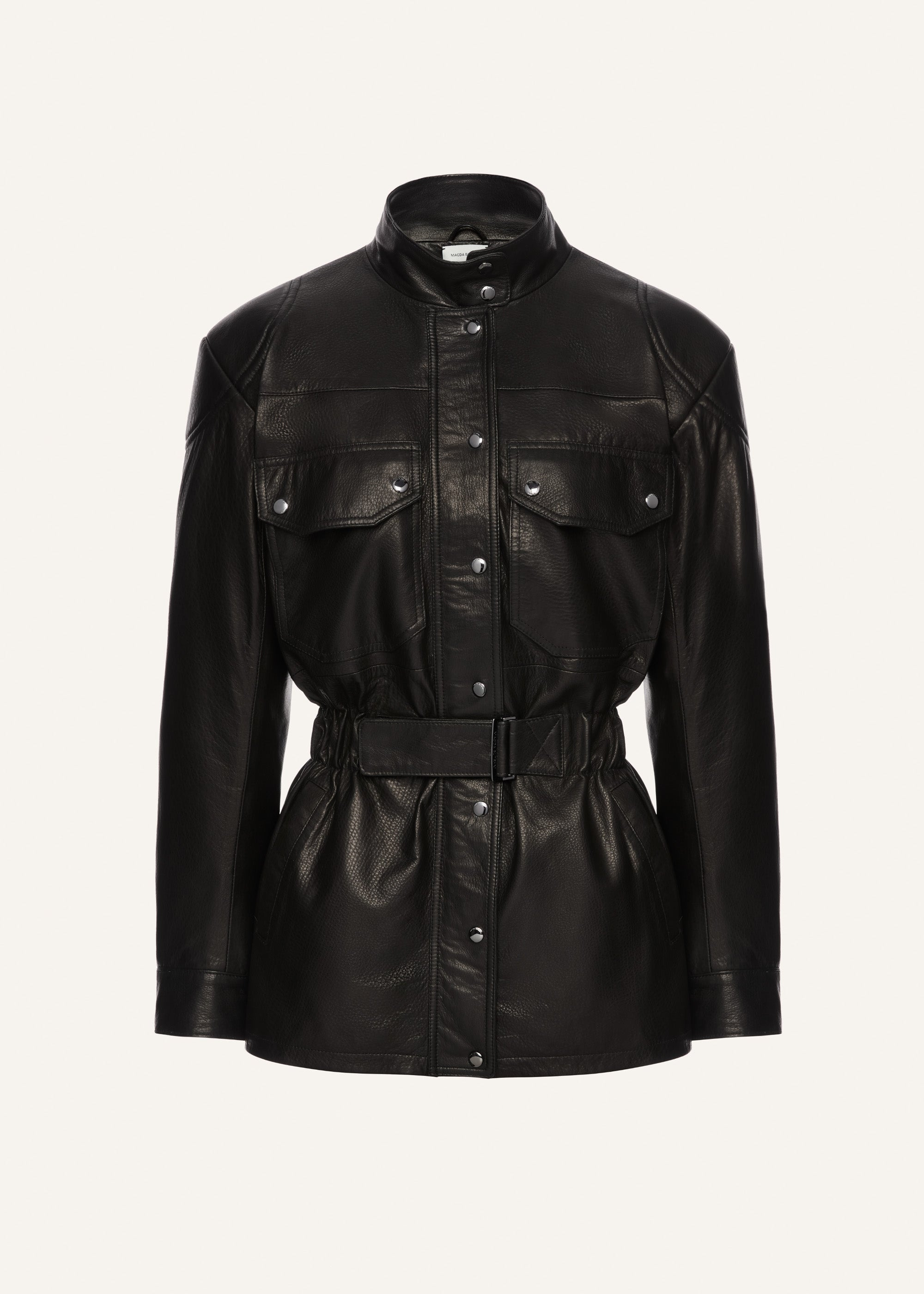 A structured utility-inspired silhouette with feminine definition, this jacket features a high snap-button collar, concealed front zipper, and contrast snap closures. A gathered waist with an additional belt detail cinches the shape, while flap pockets at the chest and vertical welt pockets at the hips add functional appeal. Details ID: 160925 Shell 100% Sheep Leather. Sizing This piece fits true to size. We recommend you get your regular size. Model is 177 cm and is wearing a size 34.