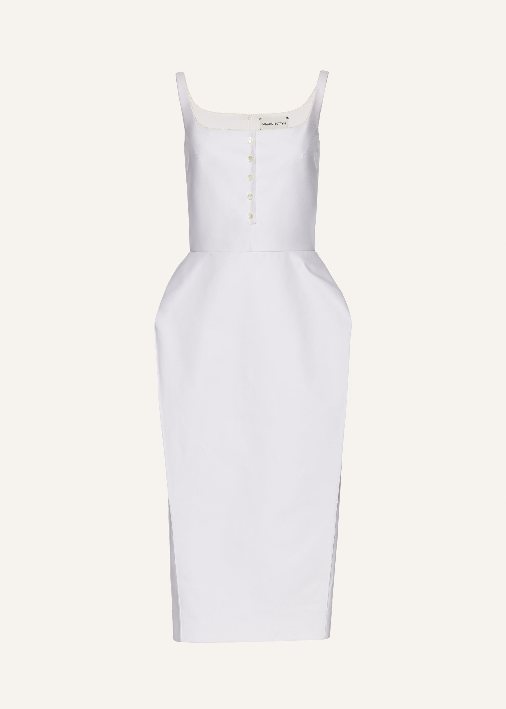 A cotton midi dress with an exaggerated hourglass shape created through hip pads, complete with a button up chest detailing. Details ID: 154725 Shell 100% Coton Lining 100% Silk Sizing This piece fits true to size. We recommend you get your regular size. Model is 180 cm and is wearing a size 34.
