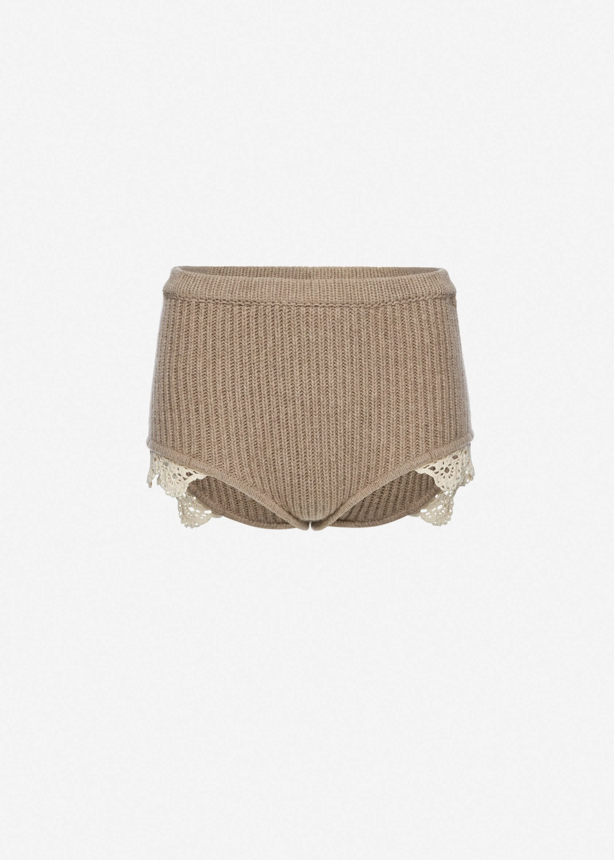 Soft cashmere knit shorts in beige. Designed with an elasticated waistband and finished with delicate crochet lace trimming along the hem. Details ID: 240426 Shell 100% Cashmere 100% Cotton Sizing This piece has a regular fit. Model is wearing a size 34.