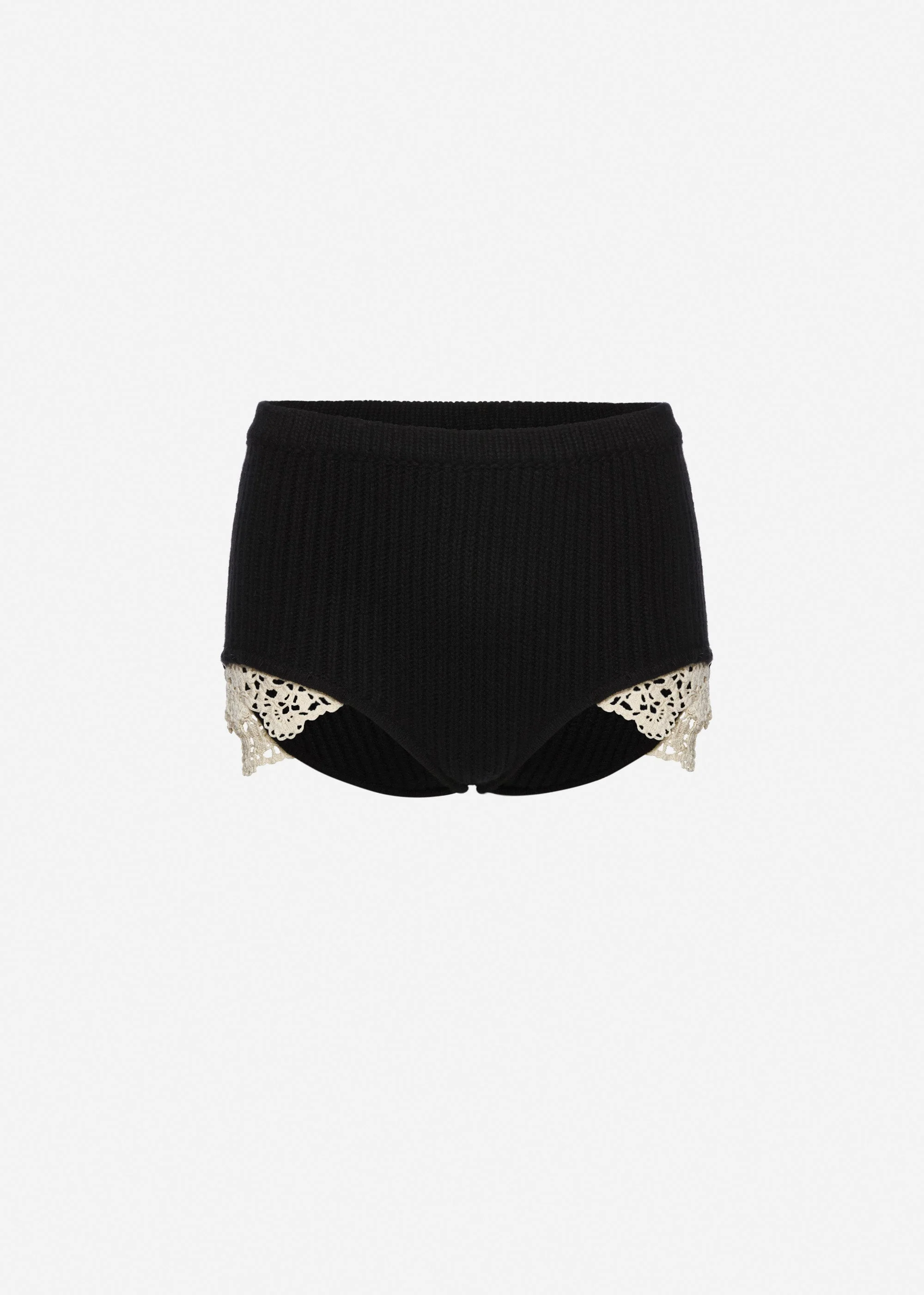 Soft cashmere knit shorts in black. Designed with an elasticated waistband and finished with delicate crochet lace trimming along the hem. Details ID: 322426 Shell 100% Cashmere 100% Cotton Sizing This piece has a regular fit. Model is wearing a size 34.