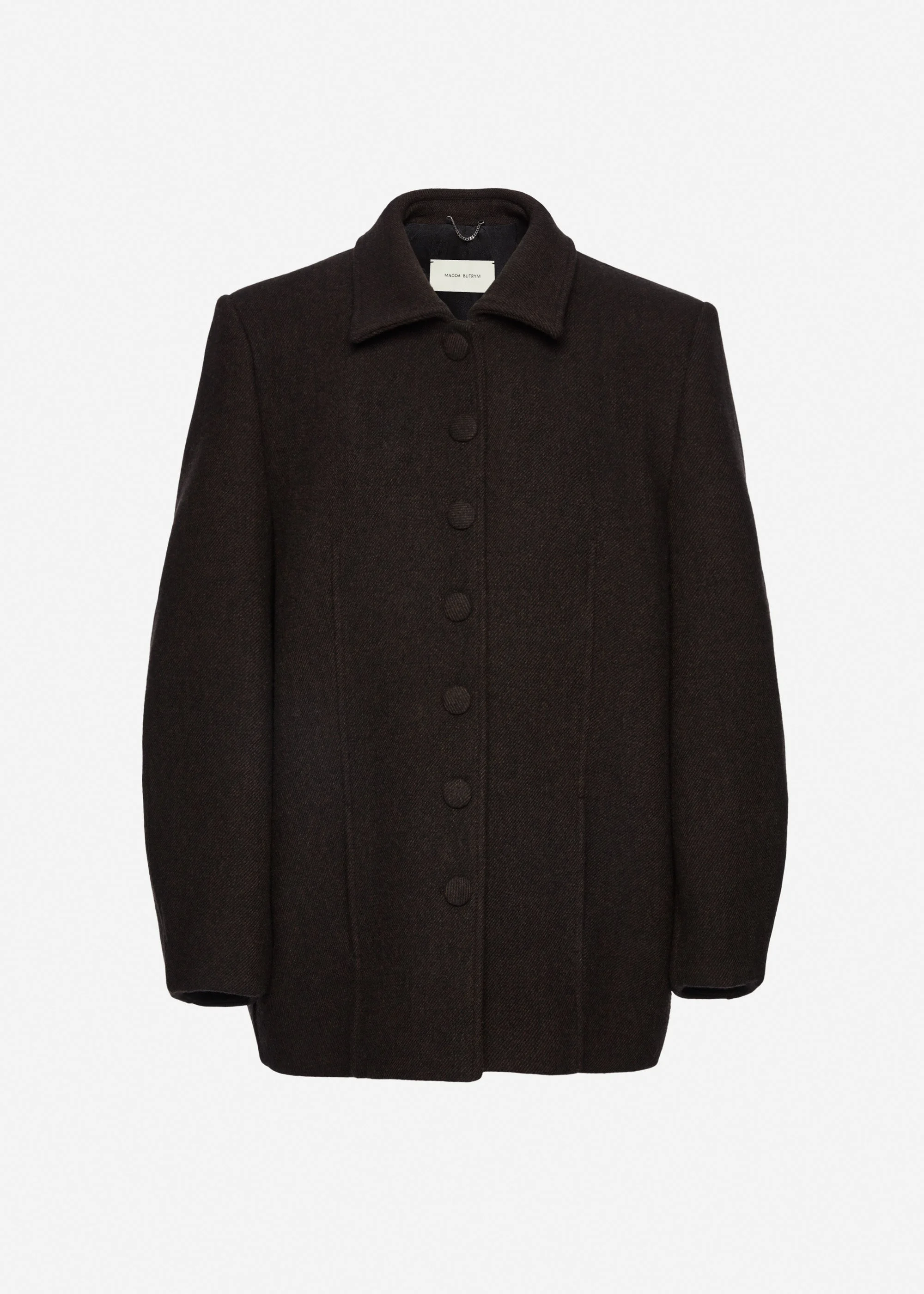 A refined jacket crafted from pure cashmere, designed with a structured collar and front button closure with seven covered buttons. Features discreet welt pockets along the dart seams and decorative topstitching throughout. The back and sleeves are softly rounded into a subtle bubble shape that tapers toward the hem. Fully lined in silk for a smooth, luxurious finish. Details ID: 341426 Shell 100% Cashmere Lining 100% Silk Sizing This piece has a regular fit. Model is wearing a size 34.