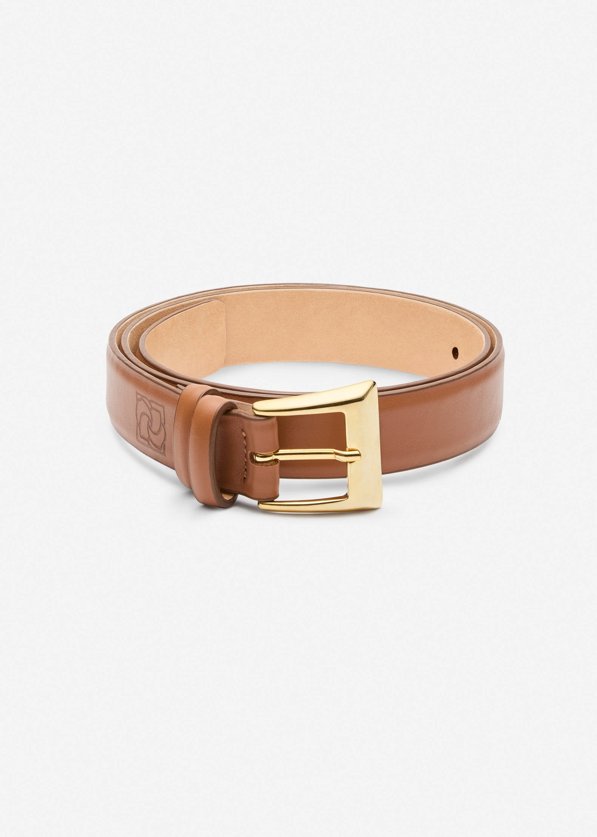 A timeless belt crafted from smooth leather, finished with a polished buckle for a clean, elegant look. Designed with subtle logo embossing. Details ID: 710526 Shell 100% Cow Leather. Sizing Approximate measurements: 72 cm to 90 cm length, 3 cm width.