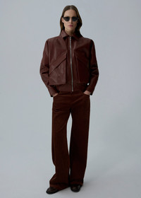Corduroy trousers with a wide, straight-leg cut and a high waist. Designed with classic jeans-style rounded front pockets and decorative topstitching throughout. Fastens on the men's side with a short front zip closure and is finished with patch pockets at the back. Details ID: 137925 Shell 80% Cotton 19% Modal 1% Elastane. Lining 100% Silk. Sizing This piece fits true to size. We recommend you get your regular size. Model is 177 cm and is wearing a size 34.